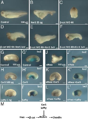 Microinjection of Xnr mRNA into a ventral blastomere rescued a complete dorsal axis in β-catenin-depleted embryos, and the Xenopus Nodal-related antagonists CerS or Lefty mRNA inhibited Hwa mRNA ectopic secondary axes in wt embryos. (A) Uninjected control embryo. (B) Xnr1 mRNA microinjection induced partial incomplete secondary axes. (C) β-cat MO radially injected embryos with complete ventralization. (D–F) Xnr1 (25 pg 1 × ventral) induced complete primary axes in β-catenin-depleted embryos. (G and G’) Control embryos injected with LacZ. (H–I’) High doses of CerS and Lefty caused smaller heads but the primary axis remained. (J and J’) Hwa mRNA injected embryos with twinned axes. (K–L’) CerS and Lefty inhibited secondary axis formation. Results from three independent experiments. (M) Diagram of the Hwa/β-catenin/Nodal/Chordin pathway. The number of embryos were as follows: (A) n = 48, all normal; (B) n = 36, 28 embryos with incomplete axis; (C) n = 18, all completely ventralized; (D–F) n = 28, 26 embryos with complete axes with large cement gland and 2 ventralized embryos; (G) n = 60, all normal; (H) n = 20, 14 embryos with no cement gland and small heads and six embryos with smaller heads with cement glands; (I) n = 44, all with head ventralization; (J) n = 26, all with complete second axes; (K) n = 108, 87 with no secondary axes, 17 embryos normal, four embryos with small ectopic heads; (L) n = 55, 43 embryos with no axes and 12 embryos with small ectopic bumps. (Scale bars: 500 µm.) |