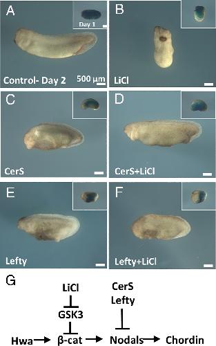 The trunk-tail organizer was rescued by a single injection of the Nodal antagonists CerS or Lefty in LiCl dorsalized embryos consisting of head structures. (A) Control embryos with 1× ventral lacZ mRNA staining in Inset. (B) Embryos treated with LiCl at the 32-cell stage have radial heads lacking trunk-tails. (C) CerS single ventral injection caused ventralization with small heads. (D) CerS restored trunk and tail structures in LiCl-treated embryos. (E) Ventralized embryo injected with Lefty mRNA. (F) Lefty mRNA single ventral injection at the four-cell stage rescued the LiCl effect increasing trunk-tail structures. Results from three independent experiments. (G) Diagram for the Hwa/β-catenin/Nodal/Chordin pathway. The number of embryos were as follows: (A) n = 163, all normal; (B) n = 151, all with strong dorsalization; (C) n = 137, all ventralized; (D) n = 123, 71 embryos with trunks and small heads, 52 embryos were partially dorsalized but less than LiCl; (E) n = 68, all with small heads; (F) n = 67, all with trunk-tails and small heads. (Scale bar, 500 µm.) |