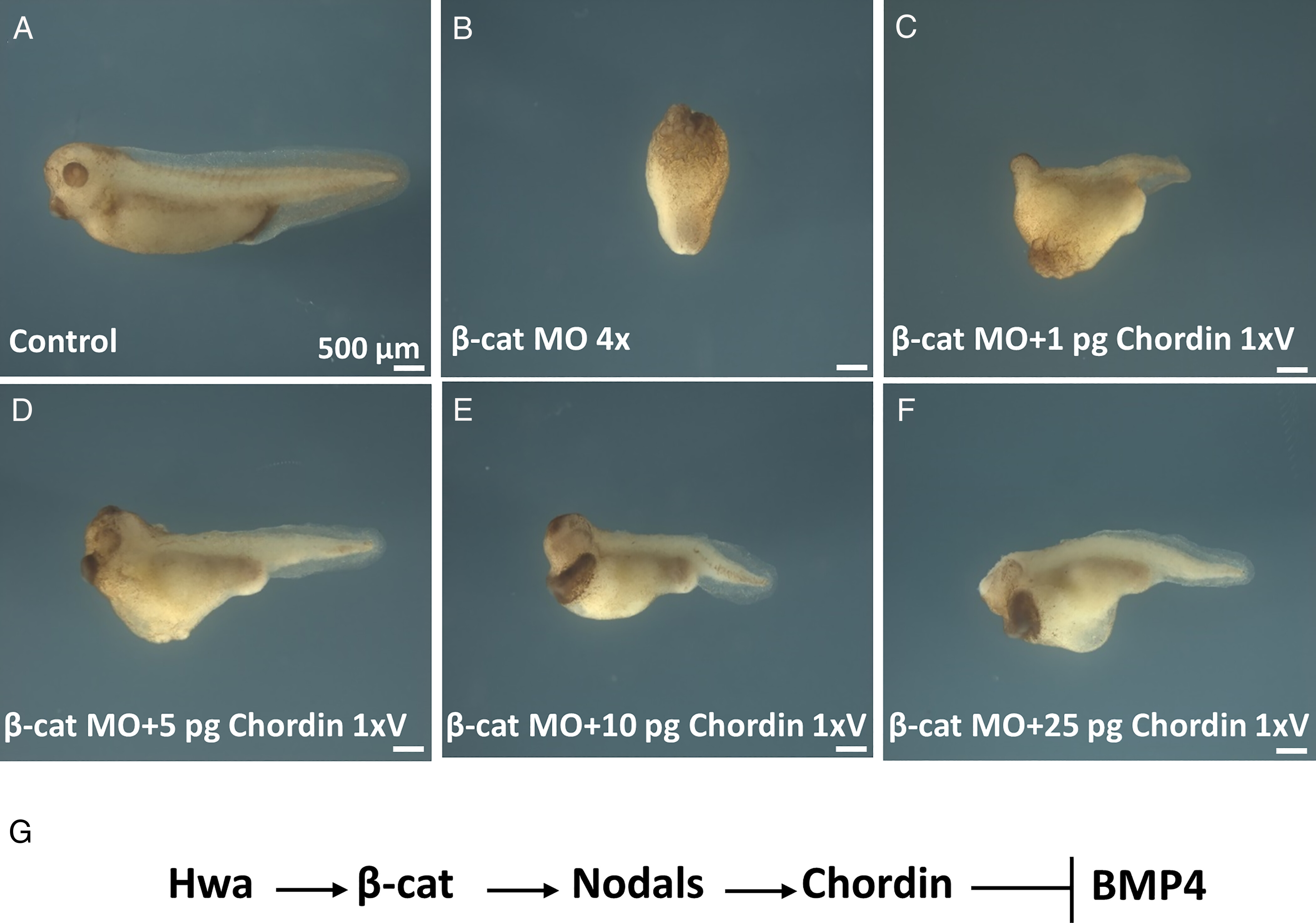 Chordin mRNA rescued both D-V and A-P axial structures in a dose-dependent manner. (A) Control embryo. (B) Embryos with 4 x injection of β-cat MO (34 pg total) were completely ventralized. (C–F) Chordin mRNA injection rescued A-P and D-V axial structures in β-catenin-depleted embryos in a dose-dependent way; note that phenotypes in both axes are intertwined. Results from three independent experiments. (G) Diagram of the Hwa/β-catenin/Nodal/Chordin/BMP4 pathway. The number of embryos were as follows: (A) n = 176, all normal; (B) n = 131, all ventralized; (C) n = 18, 1 embryo with weak axis and others ventralized; (D) n = 38, all with complete axes including eyes and cement glands; (E) n = 21, with expanded cement gland; (F) n = 118, all with very large CNS, eyes, and cement glands. In addition, experiments were performed for β-cat MO 4 x + 2 pg of Chordin, n = 16, 7 embryos with incomplete axes with no cement gland, 4 with cement gland and 5 with no axis; and β-cat MO 4 x + 50 pg of Chordin 1 x ventral, n = 14, all with strong axial rescue. (Scale bars: 500 µm.) |