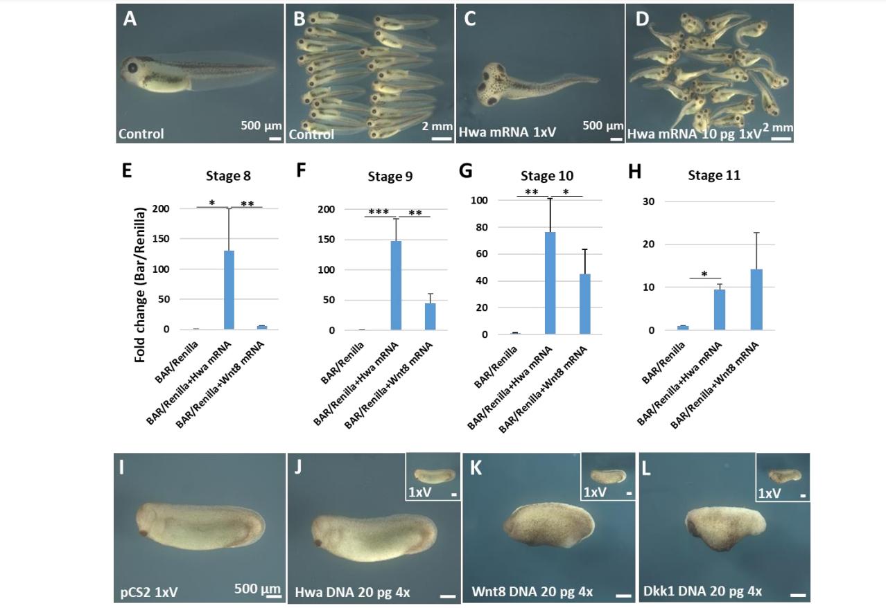 eyes. (E-H) At blastula and early gastrula stages, Hwa mRNA was more active than Wnt8