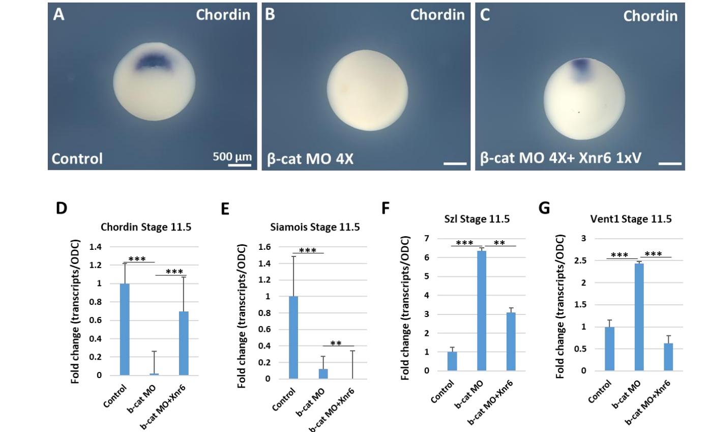 Siamois in 4 x β-cat MO injected embryos in qRT-PCR assays. (F and G) The ventral genes