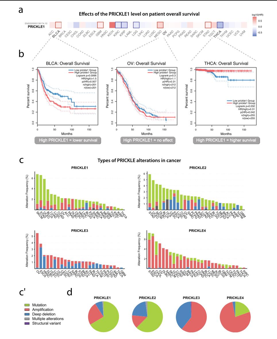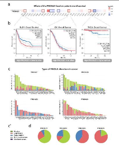 Fig. 3 a Survival heat map of PRICKLE1 across the TCGA dataset showing its expression levels. The red blocks indicate higher haz- ard risk and blue blocks indicate lower hazard risk when PRICKLE1 expression is elevated. The bold square frame indicates the statistical significance. b The diverse impact of the PRICKLE1 high (red) and low (blue) expression level on the overall survival of patients with bladder urothelial carcinoma (BLCA), ovarian serous cystadenocarcinoma (OV), and thyroid carcinoma (THCA). c PRICKLE isoforms alteration frequencies and types across TCGA cancer studies. Each column represents the indicated cancer type, and the legend (c’). The used abbreviations are explained in Supplementary Table 1. d Pie charts showing the percentage of alteration types across PRICKLE genes |