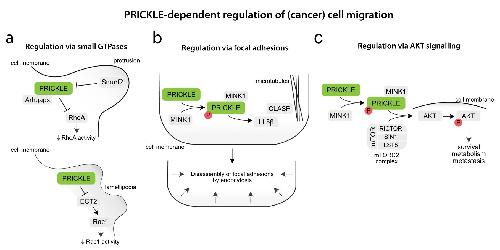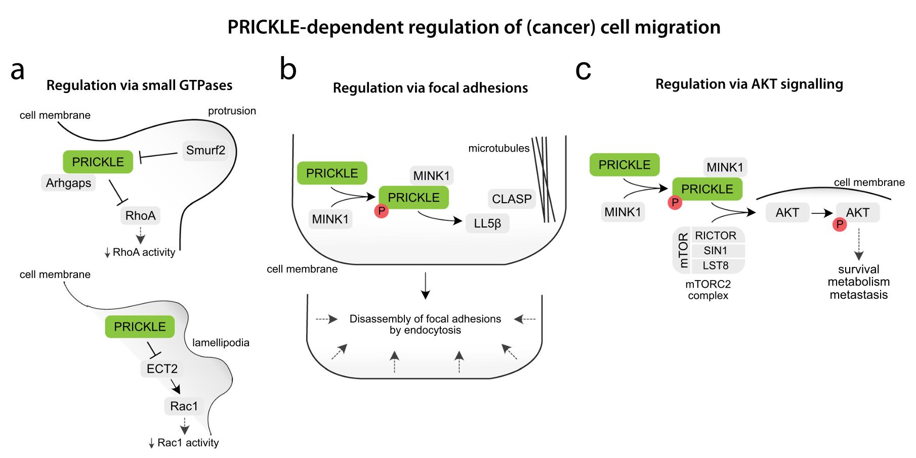 Fig. 4 Molecular mechanisms of PRICKLE-dependent signalling regulation in migrating (cancer) cells, via a small GTPases, b focal adhesions, and c AKT signalling. |