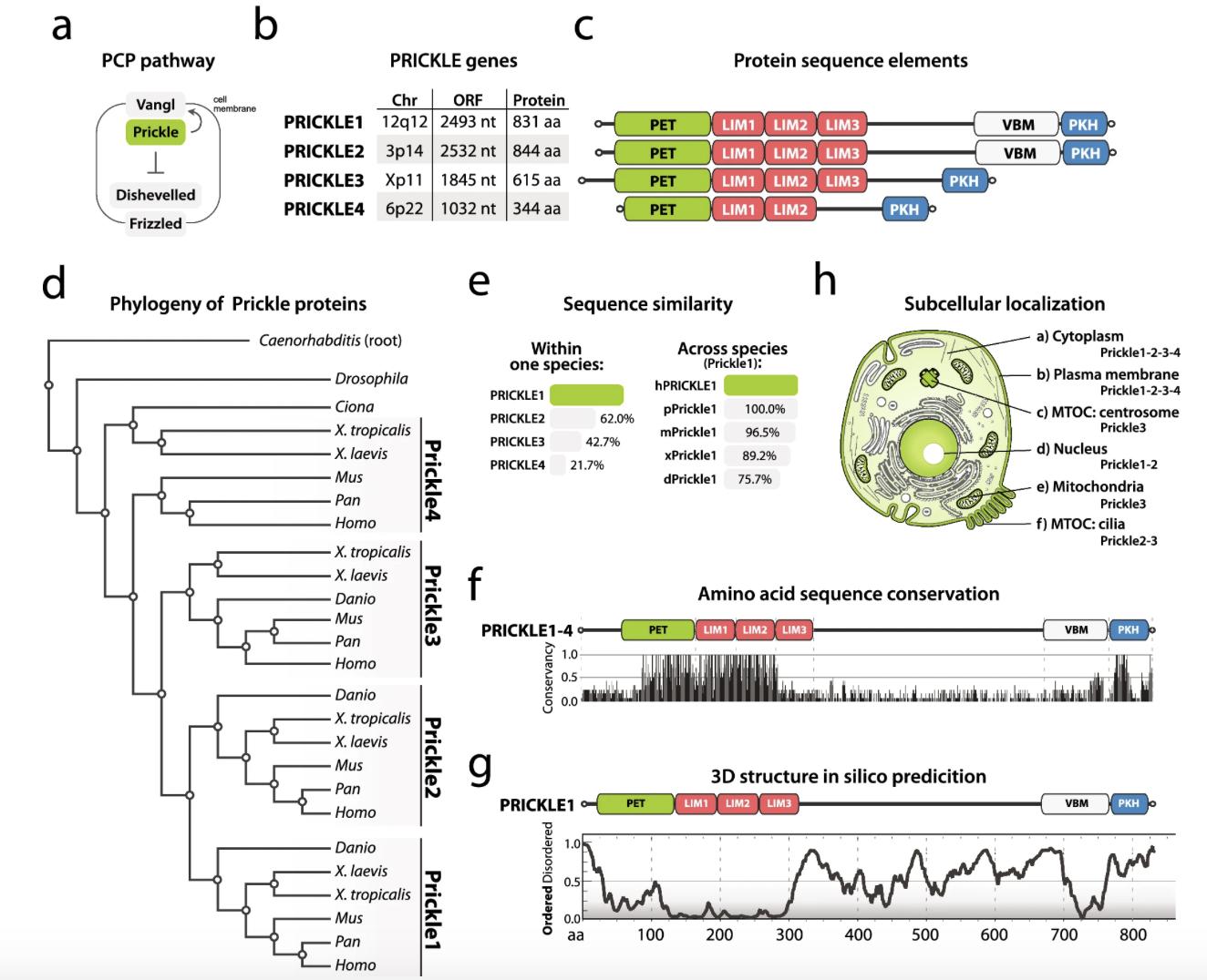 Fig. 1 a Basic PCP pathway components and their subcellular distribution. b The human PRICKLE1-4 gene locations and basic info. c Sequence elements of human PRICKLE1-4. For single sequence element description and abbreviations, see the accompanying text. d Phylogenetic analysis the of vertebrate Prickle family. Uniprot protein database was used to search for Prickle family members from main vertebrate species, which often serve as model organisms like Homo Sapiens, Pan Troglodytes, Mus musculus, Xenopus laevis, Xenopus tropicalis, and Danio rerio. We also added invertebrate species such as Ciona intestinalis, Drosophila melanogaster, and Caenorhabditis elegans as out-grouping to construct a phylogenetic tree. After collecting the relevant protein sequences, we used the MUSCLE algorithm to align the amino acid sequences and then used the Maximum Likelihood method to construct a phylogenetic tree. The tree shows the relationship of vertebrate Prickle1-4. A detailed description can be found in Data availability. e Amino acid sequence conservation in human PRICKLE1-4, compared to PRICKLE1; and individual combinations with Prickle1 isoforms across vertebrates, compared to human PRICKLE1. f Single amino acid sequence conservation in human PRICKLE1-4 showing the most conserved amino acids. g 3D structure in silico prediction for human PRICKLE1 using PONDR-Fit. Score 0.0–0.5 (the bottom part) means that the region forms the secondary structure, score 0.5–1.0 (the upper part) identifies a disordered region. h Prickle protein schematized depiction of eukaryotic cells showing six described subcellular locations of s |