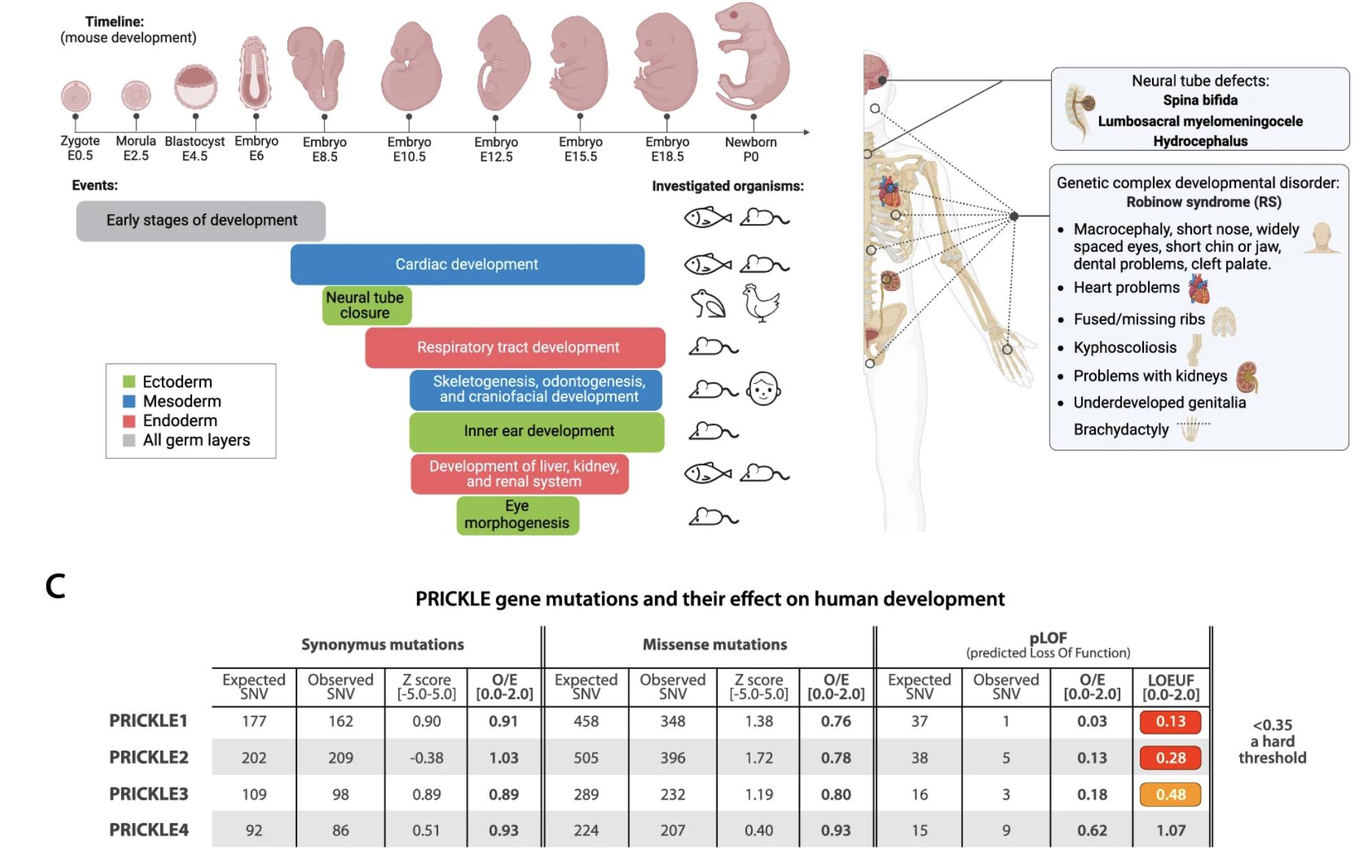 Fig. 2 a Mapping the Prickle-regulated events during vertebrate development, shown on the example of mouse development. The investigated organisms are depicted on the right. Created with BioRender.com. b Developmental defects in humans, regulated by PRICKLE proteins, can be divided into two groups. Created with BioRender.com. c gnomAD-derived data showing PRICKLE gene mutations in three categories. Our analysis shows that both PRICKLE1 and PRICKLE2 are under the hard pLOF selection, as depicted by low LOEUF values. Higher (more positive) Z scores indicate that the transcript is more intolerant of variation (more constrained). See the text for explanation and abbreviations. |