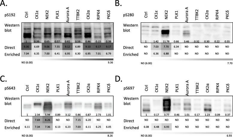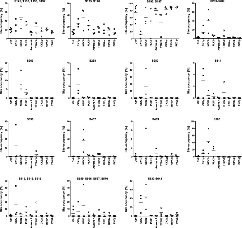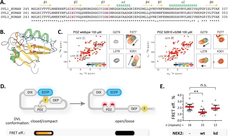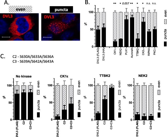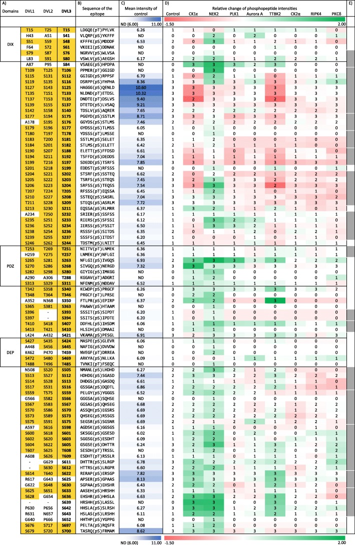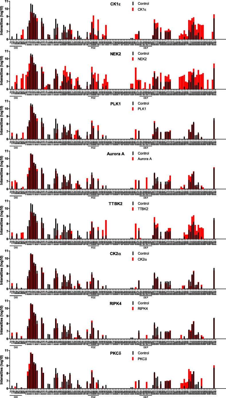 BACKGROUND: Dishevelled (DVL) is an essential component of the Wnt signaling cascades. Function of DVL is controlled by phosphorylation but the molecular details are missing. DVL3 contains 131 serines and threonines whose phosphorylation generates complex barcodes underlying diverse DVL3 functions. In order to dissect the role of DVL phosphorylation we analyzed the phosphorylation of human DVL3 induced by previously reported (CK1ε, NEK2, PLK1, CK2α, RIPK4, PKCδ) and newly identified (TTBK2, Aurora A) DVL kinases. METHODS: Shotgun proteomics including TiO2 enrichment of phosphorylated peptides followed by liquid chromatography tandem mass spectrometry on immunoprecipitates from HEK293T cells was used to identify and quantify phosphorylation of DVL3 protein induced by 8 kinases. Functional characterization was performed by in-cell analysis of phospho-mimicking/non-phosphorylatable DVL3 mutants and supported by FRET assays and NMR spectroscopy. RESULTS: We used quantitative mass spectrometry and calculated site occupancies and quantified phosphorylation of > 80 residues. Functional validation demonstrated the importance of CK1ε-induced phosphorylation of S268 and S311 for Wnt-3a-induced β-catenin activation. S630-643 cluster phosphorylation by CK1, NEK2 or TTBK2 is essential for even subcellular distribution of DVL3 when induced by CK1 and TTBK2 but not by NEK2. Further investigation showed that NEK2 utilizes a different mechanism to promote even localization of DVL3. NEK2 triggered phosphorylation of PDZ domain at S263 and S280 prevents binding of DVL C-terminus to PDZ and promotes an open conformation of DVL3 that is more prone to even subcellular localization. CONCLUSIONS: We identify unique phosphorylation barcodes associated with DVL function. Our data provide an example of functional synergy between phosphorylation in structured domains and unstructured IDRs that together dictate the biological outcome. Video Abtract.