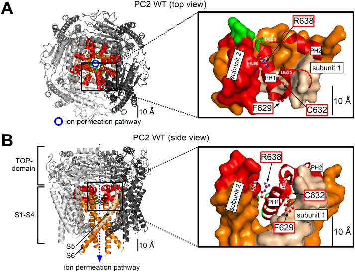 Figure 1. Localization of three polycystin-2 pore loop residues (F629, C632, R638) mutated in ADPKD.Top (A) and side (B) view of human wildtype polycystin-2 (PC2 WT) homotetramer in ribbon representation generated using atom coordinates from PDB entry 6T9N (35). Individual protomers are colored in different shades of gray, and transmembrane domains S5 and S6 of all protomers are shown in beige and orange, respectively. The pore loop is in red, except for three selectivity filter residues (641-LGD-643), which are in green. The insets show a portion of PC2 on an expanded scale, where the pore loop of subunit 1 (shown in ribbon representation) forms multiple intra- and intersubunit contacts with several other PC2 domains of subunit 1 and 2 shown in surface representation. Three pore loop residues mutated in ADPKD (F629, C632, and R638) are localized in the pore helix 1 (PH1) and their side chains are shown in ball-and-stick representation with carbon atoms in red, nitrogen in blue, and sulfur in yellow. Hydrogen atoms are omitted for clarity. |