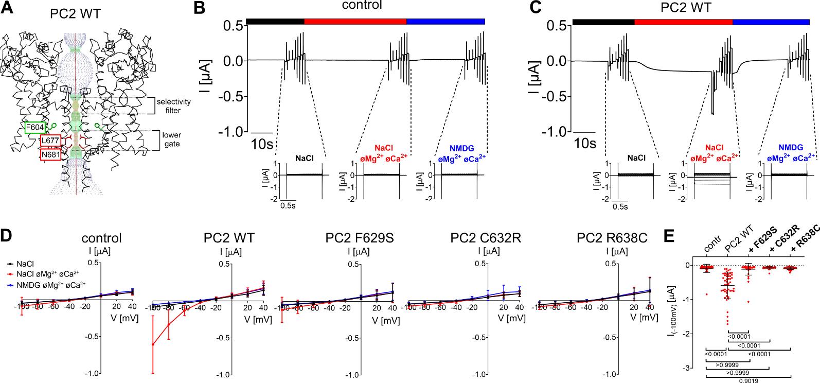 Figure 3. Pore mutations F629S, C632R and R638C exhibit a loss-of-function effect on PC2 F604P. (A) Profile of the ion permeation pathway in PC2 F604P generated using the HOLE program ( 60 ) is shown along with two diagonally opposed protomers in black wire representation. Analysis was made using the PDB entry 6D1W ( 61 ). It is noteworthy that the F604P mutation (shown in sticks representation and in green) removes the pathway constriction at the level of the lower gate by altering the position of L677 and N681 residues. (B) Representative whole-cell current trace obtained in a Xenopus laevis oocyte injected with 7.5 ng cRNA encoding human PC2 F604P is shown to the left of the corresponding average I/V-plot (mean ± SD) obtained from recordings using a similar protocol as described in Fig. 2 . (C) Average I/V-plots (mean ± SD) were obtained from oocytes expressing PC2 with pore mutations (F629S, C632R, R638C) introduced into PC2 F604P and from control oocytes using a similar experimental protocol as in (B) (N=3, 33≤n≤39; N indicates the number of different batches of Xenopus laevis oocytes, and n indicates the number of individual oocytes analysed per experimental group). (D) Summary data of the same experiments as shown in (C). The maximal inward currents reached during application of hyperpolarizing pulses of −100 mV in divalent free NaCl (NaCl øMg2+ øCa2+) bath solution are shown. The p-values were calculated by Kruskal-Wallis test with Dunn’s post hoc test. |