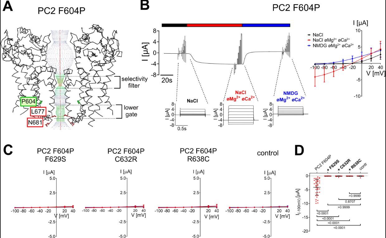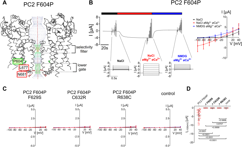 Figure 3. Pore mutations F629S, C632R and R638C exhibit a loss-of-function effect on PC2 F604P.A, profile of the ion permeation pathway in PC2 F604P generated using the HOLE program (60) is shown along with two diagonally opposed protomers in black wire representation. Analysis was made using the PDB entry 6D1W (61). It is noteworthy that the F604P mutation (shown in sticks representation and in green) removes the pathway constriction at the level of the lower gate by altering the position of L677 and N681 residues. B, representative whole-cell current trace obtained in a Xenopus laevis oocyte injected with 7.5 ng cRNA encoding human PC2 F604P is shown to the left of the corresponding average I/V-plot (mean ± SD) obtained from recordings using a similar protocol as described in Figure 2. C, average I/V-plots (mean ± SD) were obtained from oocytes expressing PC2 with pore mutations (F629S, C632R, R638C) introduced into PC2 F604P and from control oocytes using a similar experimental protocol as in (B) (N = 3, 33 ≤ n ≤ 39; N indicates the number of different batches of Xenopus laevis oocytes, and n indicates the number of individual oocytes analyzed per experimental group). D, Summary data of the same experiments as shown in (C). The maximal inward currents reached during the application of hyperpolarizing pulses of −100 mV in divalent free NaCl (NaCl øMg2+ øCa2+) bath solution are shown. The p-values were calculated by the Kruskal-Wallis test with Dunn’s post hoc test. |