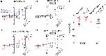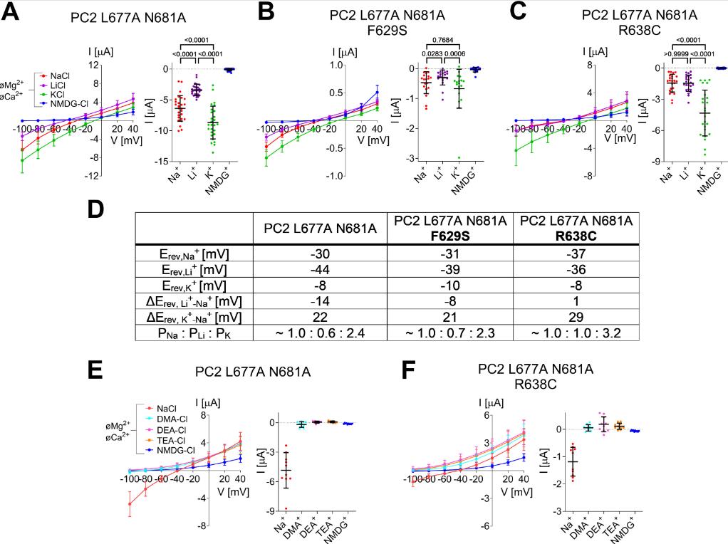 Figure 6. Pore mutation R638C, but not F629S, alters the selectivity of PC2 L677A N681A for monovalent cations. (A-C) Selectivity for small inorganic monovalent cations was assessed for PC2 L677A N681A (A), PC2 L677A N681A F629S (B) and PC2 L677A N681A R638C (C) by replacing Na+ in the bath solution by K+, Li+ or NMDG+ in the absence of divalent cations. Left panels: Average I/V-plots (mean ± SD) were obtained using a similar experimental approach as shown in Fig.2. To correct for endogenous oocyte currents (in particular K+ currents), the average whole-cell current values measured in control oocytes ( Fig. S4A ) were subtracted from the corresponding individual whole-cell current values measured in oocytes from the same batch expressing PC2 constructs. Right panels: Summary data show the maximal inward currents reached during application of hyperpolarizing pulses of −100 mV in the presence of different cations in the bath as indicated. Measurements from individual oocytes and mean ± SD are shown (N=3, 19≤n≤27; N indicates the number of different batches of Xenopus laevis oocytes, and n indicates the number of individual oocytes analysed per experimental group; the p-values were calculated by repeated measures one-way ANOVA with Bonferroni post hoc test (A, C) or Friedman test with Dunn’s post hoc test (B)). (D) Reversal potentials (in mV) observed in the presence of Na+ (Erev,Na+), Li+ (Erev,Li+) or K+ (Erev,K+) were estimated from the averaged I/V-curves shown in A-C. Reversal potential shifts were calculated by subtracting Erev,Na+ from Erev,Li+ (ΔErev, Li+-Na+) or from Erev,K+ (ΔErev, K+-Na+) and were used to estimate permeability ratios (PNa : PLi : PK; equation 1 ). (E, F) In additional experiments permeability for mid-size organic monovalent cations was assessed for PC2 L677A N681A (E) and PC2 L677A N681A R638C (F) by replacing Na+ in the bath solution by DME+, DEA+ or TEA+ in the absence of divalent cations. For correction, the values shown in Fig. S4B were used. Mean ± SD and individual data points are shown (N=1, n=10). |