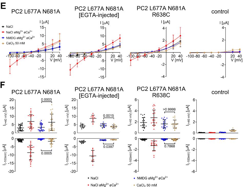 Figure 9. Mutation of a selectivity filter residue (D643A) partially rescues the Na+ conductance of PC2 L677A N681A with R638C pore mutation and reduces channel inhibition by divalent cations (Ca2+, Mg2+). (A-D) Left panels: Average I/V-plots (mean ± SD) were obtained from oocytes expressing PC2 L677A N681A with R638C pore mutation (A), with a combination of R638C and D643A mutations (B), without additional mutations (C), or with D643A mutation (D) using a similar experimental protocol as described in Fig. 2 . Right panels: The summary data show the maximal inward currents reached during application of hyperpolarizing pulses of −100 mV in different bath solutions as indicated. Measurements from individual oocytes and mean ± SD are shown (N=2, n=24; N indicates the number of different batches of Xenopus laevis oocytes, and n indicates the number of individual oocytes analysed per experimental group; the p-values were calculated by repeated measures one-way ANOVA with Bonferroni post hoc test). (E) Summary data of the same experiments as shown in A-D. The maximal inward currents reached during application of hyperpolarizing pulses of −100 mV in divalent free NaCl (NaCl øMg2+ øCa2+) bath solution are shown. The p-values were calculated by one-way ANOVA with Bonferroni post hoc test. |