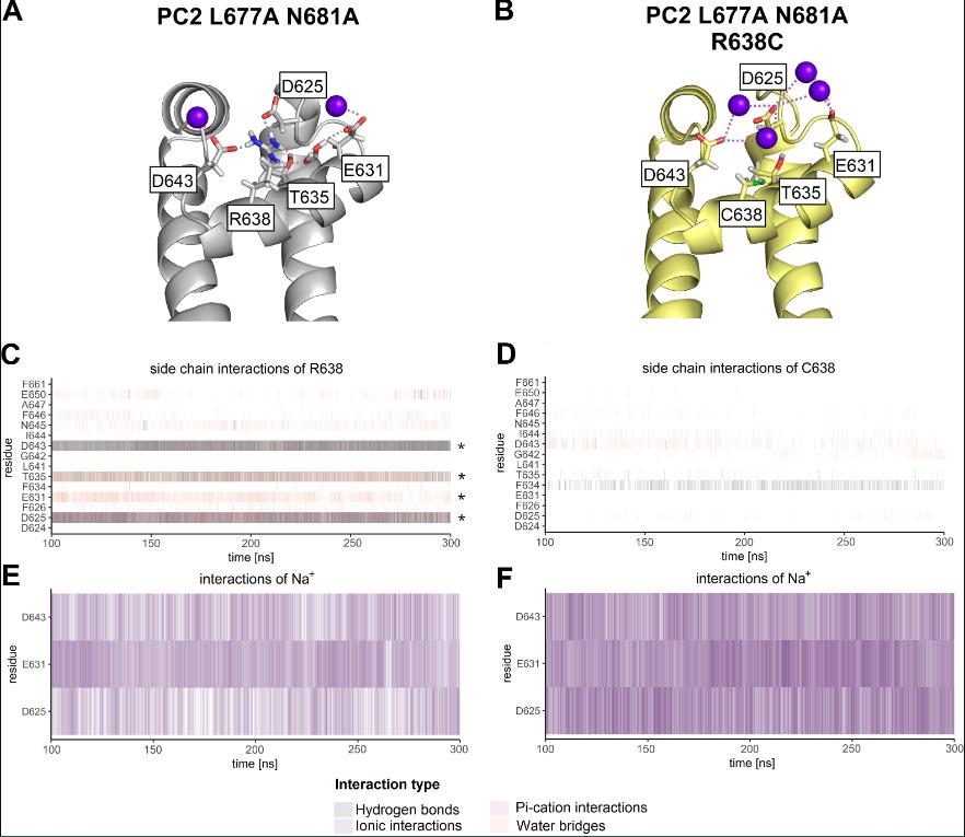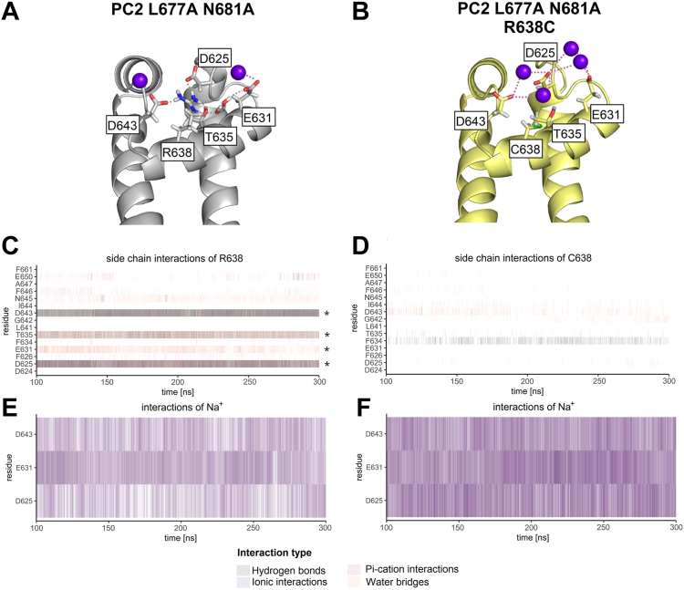 Figure 8. Atomistic molecular dynamics (MD) simulations suggest that R638C mutation disturbs network of side chain interactions within the pore loop and fosters ionic interactions between Na+ and negatively charged pore loop residues. Representative snapshots taken from the first out of three replica MD simulations of PC2 L677A N681A without (A) or with R638C pore mutation (B) show key side chain interactions and ionic interactions with Na+ of indicated residues within the pore loop. Ribbon diagrams of the channel’s pore loop are shown with side chains of indicated residues in sticks representation, carbon atoms are in grey (A) or yellow (B), hydrogen in white, oxygen in red, sulfur in green, nitrogen in blue. Na+ are represented as violet spheres. (C-F) Analysis of interactions was performed over the last 200 ns of the first out of three replica MD simulations of PC2 L677A N681A without (C, E) or with R638C pore mutation (D, F). Each vertical line represents the formation of at least one interaction of the specified type per trajectory frame. Interaction types are represented by different colors as indicated. Results from four PC2 subunits are pooled. A darker color intensity corresponds to multiple interactions of the same type observed at the same time point. Key interaction partners of R638 side chain are highlighted with asterisks in C. Ionic interactions between Na+ ions and the negatively charged pore loop residues (D625, E631, D643) are increased due to R638C substitution (E, F). |