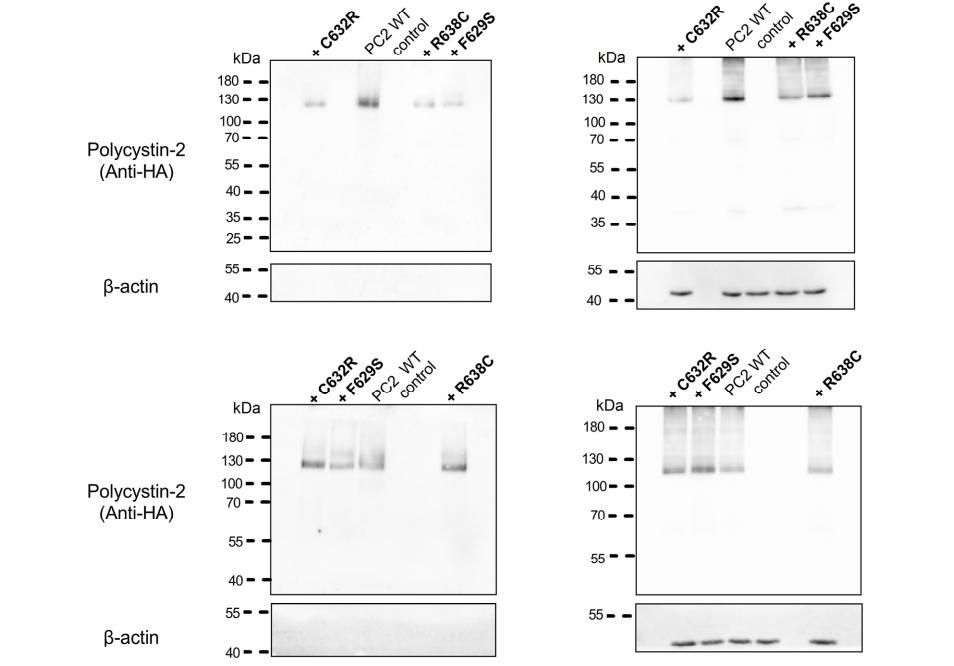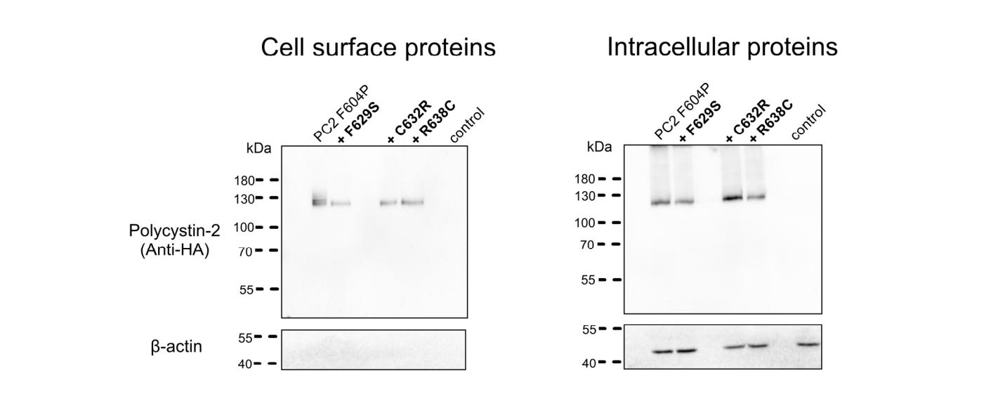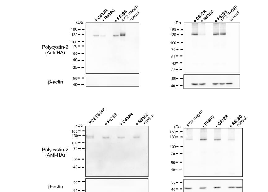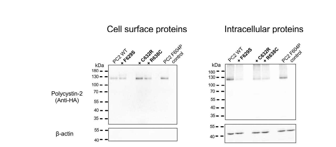 Figure S2: Western blot analysis of cell surface and intracellular expression of PC2 F604P without and with F629S, C632R, R638C pore mutations. Intracellular (right panels) or cell surface (left panels) expression of HA-tagged PC2 F604P without or with a pore mutation as indicated (+F629S, +C632R or +R638C) from three different oocyte batches (N=3). No specific signal was detected with the anti-HA antibody in control oocytes. To validate separation of cell surface proteins from intracellular proteins, blots were stripped and reprobed using an antibody against β-actin. |