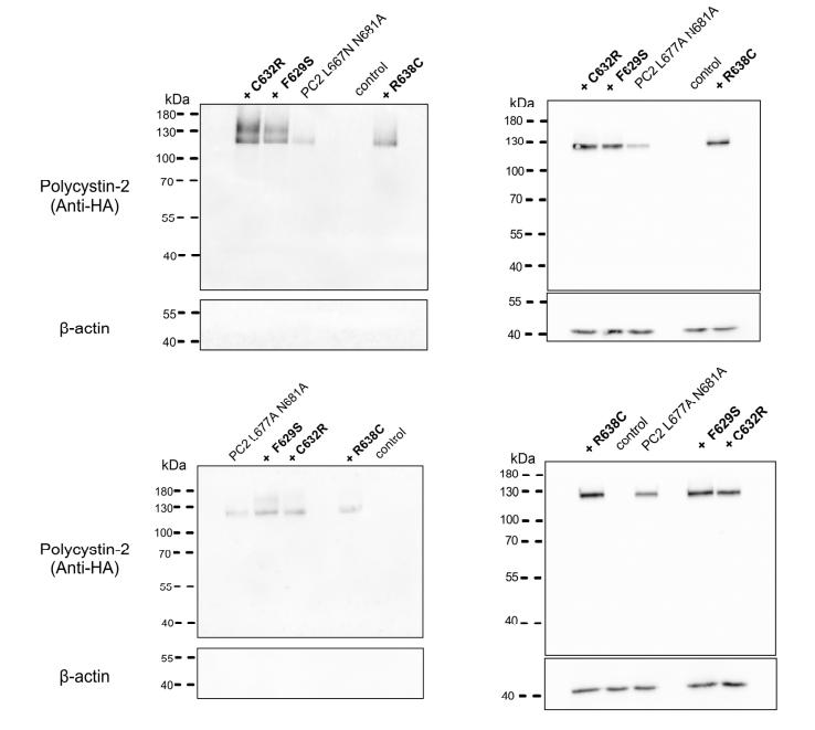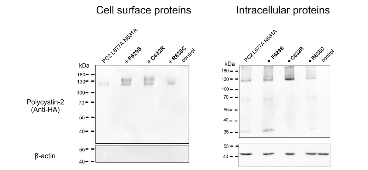Figure S3: Western blot analysis of cell surface and intracellular expression of PC2 L677A N681A without and with F629S, C632R, R638C pore mutations. Intracellular (right panels) or cell surface (left panels) expression of HA-tagged PC2 L677A N681A without or with a pore mutation as indicated (+F629S, +C632R or +R638C) from three different oocyte batches (N=3). No specific signal was detected with the anti-HA antibody in control oocytes. To validate separation of cell surface proteins from intracellular proteins, blots were stripped and reprobed using an antibody against β-actin. |