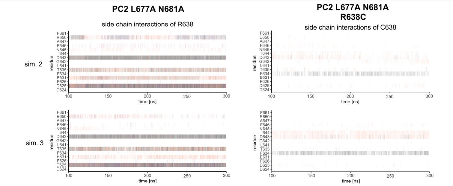 Figure S5: Analysis of side chain and backbone interactions of R638 or C638 in PC2 L677A N681A or PC2 L677A N681A R638C, respectively. Data were obtained over the last 200 ns of each replica MD simulation (sim. 1, sim. 2, sim.3). Side chain interactions observed in the first MD simulation are shown in Fig. 8C, D. Each vertical line represents the formation of at least one interaction of the specified type per trajectory frame. Interaction types are represented by different colors as indicated. Results from four PC2 subunits are pooled. A darker color intensity corresponds to multiple interactions of the same type observed at the same time point. |
