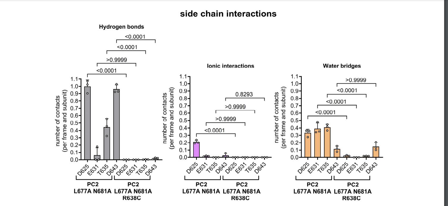 Figure S6: Quantification of interactions formed by the side chain of R638 or C638 with the four key pore loop residues. Summary data obtained from the same MD simulations as shown in Fig. 8C, D and Fig. S8. Each dot represents the average number of contacts formed by the side chain atoms of R638 (PC2 L677A N681A) or C638 (PC2 L677A N681A R638C) with an indicated pore loop residue over the last 200 ns of each MD simulation per trajectory frame and per PC2 subunit (n=3, the p-values were calculated by one-way ANOVA with Bonferroni post hoc test). |