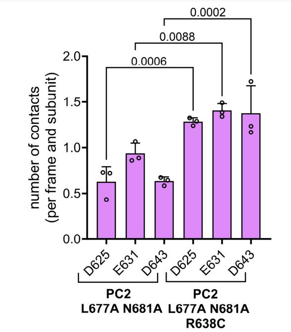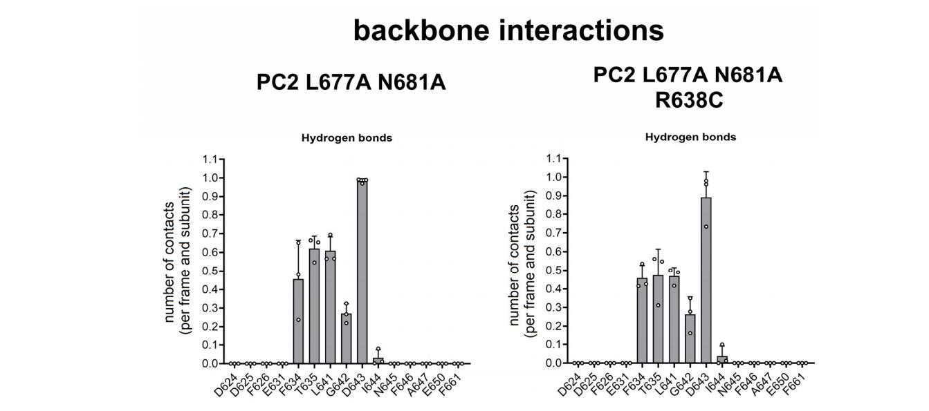 Figure S7: Quantification of interactions formed by the backbone of R638 or C638 with the pore loop residues. Summary data obtained from the same MD simulations as shown in Fig. S8. Each dot represents the average number of contacts formed by the backbone atoms of R638 (PC2 L677A N681A) or C638 (PC2 L677A N681A R638C) with an indicated pore loop residue over the last 200 ns of each MD simulation per trajectory frame and per PC2 subunit (n=3). |