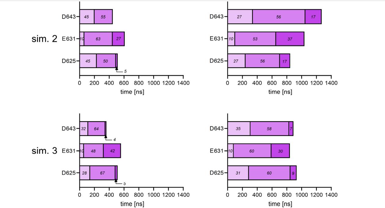 Figure S10: R638C substitution increases the duration of Na+ interactions with negatively charged pore loop residues D625, E631 and D643. Cumulative time of interactions between Na+ ions and the indicated residues in all four PC2 subunits over the last 200 ns of the simulation time in three replica simulations (sim. 1, sim. 2, sim. 3) of PC2 L677A N681A without (left panels) or with pore mutation R638C (right panels). Duration of each interaction was estimated by multiplying the number of consecutive frames, in which this interaction was observed, by the sampling interval of the MD trajectory (sim. 1: 100 ps; sim. 2 and 3: 300 ps). More than one Na+ can interact with a respective residue simultaneously, therefore the cumulative time of interactions may exceed the cumulative MD simulation time (4 subunits × 200 ns = 800 ns). Interactions are grouped by duration into three categories, ‘short-term’ (< 1 ns), ‘medium-term’ (1 – 10 ns) and ‘long-term’ (> 10 ns) interactions, and their respective proportions are shown by different colors and numbers inside bars (in % of total for each residue). |