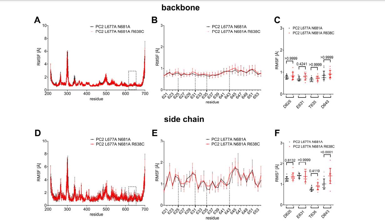 Figure S11: R638C substitution significantly increases root mean square fluctuation (RMSF) of D643 side chain. RMSF values were calculated for the side chain atoms (A-C) and backbone atoms (D-F) over the last 200 ns of each replica MD simulation. Values for the whole protein (A, D), for the pore loop (B, E; within the frame in A, D) and for the four key pore loop residues (C, F; indicated by vertical dotted lines in B, E) are shown (n=12: 4 subunits × 3 simulations; the p-values were calculated by one-way ANOVA with Bonferroni post hoc test). |