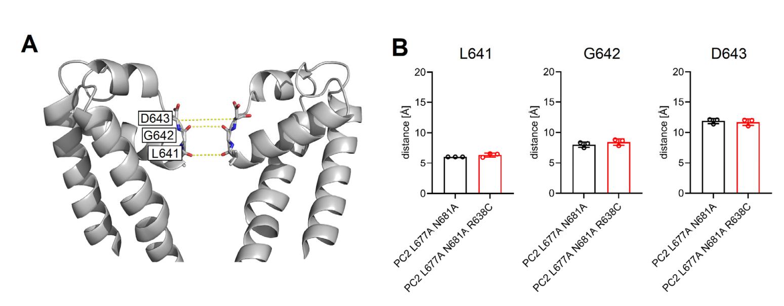 Figure S12: R638C mutation did not alter the dimensions of the channel’s selectivity filter. (A) Pore loop regions of two diagonally opposed PC2 protomers in ribbon representation with three residues forming the selectivity filter (L641, G642 and D643) in sticks representation are shown. Distances between corresponding atoms of two subunits which are connected by yellow dotted lines were calculated and are shown in (B). Mean distances were calculated in each replica MD simulation (n=3). |