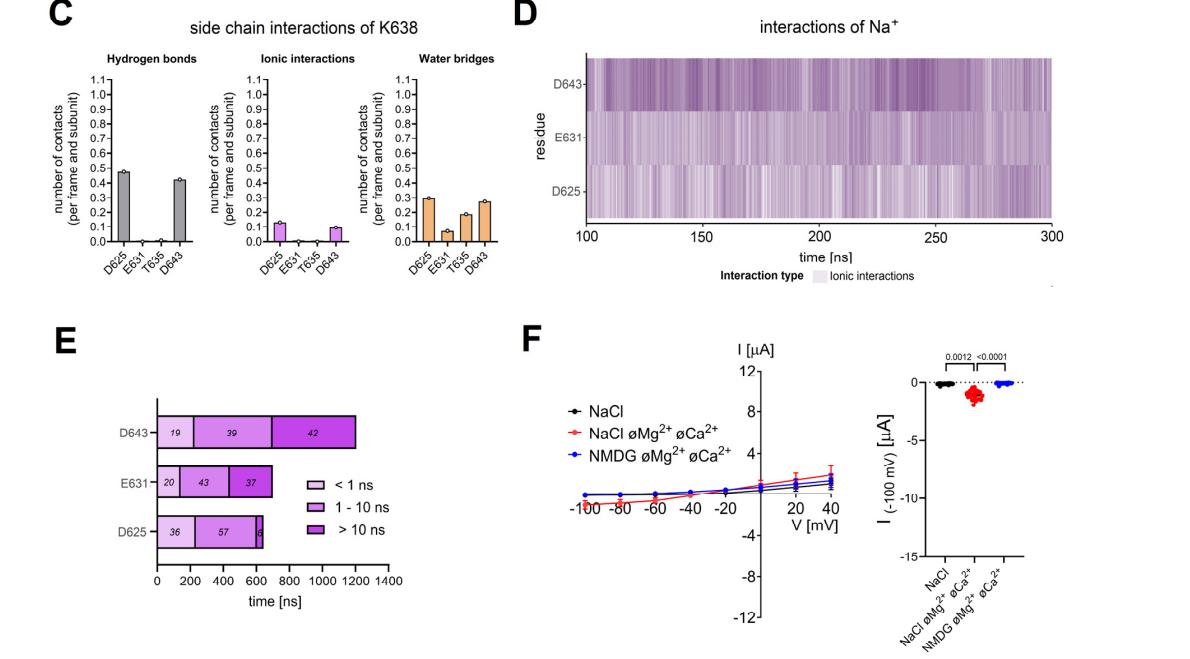Figure S13: (C) Quantification of interactions formed by the side chain of K638 with the four pore loop residues (D625, E631, T635, D643). Summary data was obtained from the same MD simulation as shown in (B). (D) Analysis of ionic interactions between Na+ ions and the negatively charged pore loop residues (D625, E631, D643) was performed for the last 200 ns of the MD simulation. Individual interactions are represented with vertical violet lines. Results from four PC2 subunits are pooled. Darker color intensity corresponds to multiple interactions observed at the same time point. (E) Cumulative time of interactions between Na+ ions and the indicated residues in all four PC2 subunits over the last 200 ns of the simulation time. Quantification of the interaction time was performed as described in Figure S13. Interactions are grouped by duration into three categories, ‘short-term’ (< 1 ns), ‘medium-term’ (1 – 10 ns) and ‘long-term’ (> 10 ns) interactions, and their respective proportions are shown by different colors and numbers inside bars (in % of total for each residue). (F) Left panel: Average I/Vplot (mean ± SD) were obtained from oocytes expressing PC2 L677A N681A with pore mutation R638K using a similar experimental protocol as described is Fig. 2. Right panel: Summary data show the maximal inward currents reached during application of hyperpolarizing pulses of −100 mV in different bath solutions as indicated. Measurements from individual oocytes and mean ± SD are shown (N=2, n=23; N indicates the number of different batches of Xenopus laevis oocytes, and n indicates the number of individual oocytes analysed per experimental group; the p-values were calculated by Friedman test with Dunn’s post hoc test). |
