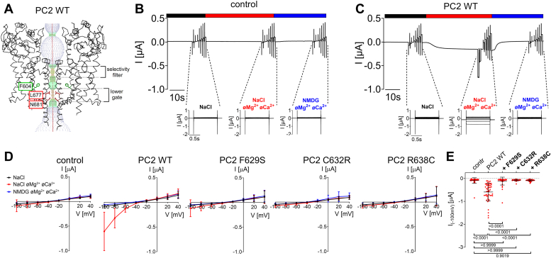 Figure 2. Pore mutations F629S, C632R and R638C exhibit a loss-of-function effect on PC2 WT.A, profile of the ion permeation pathway in PC2 WT generated using the HOLE program (60) is shown along with two diagonally opposed protomers in black wire representation. Analysis was made using the PDB entry 6T9N (35). Two apparent pathway constrictions are located at the level of the selectivity filter, and the lower gate as indicated. With an intact S5 residue F604 (in sticks representation and in green), the narrowest part of the pathway is formed by L677 and N681 side chains shown in sticks representation and in red (the lower gate). B and C, representative whole-cell current traces obtained in a control Xenopus laevis oocyte (B) or an oocyte injected with 15 ng cRNA encoding human PC2 WT (C). Application of different bath solutions (a standard NaCl solution with or without divalent cations (øMg2+ øCa2+) or an NMDG+ solution without divalent cations) is indicated by black, red, and blue bars, respectively. For each condition, voltage step protocols were performed with consecutive 1000 ms voltage steps in 20 mV increments starting with a hyperpolarizing pulse to −100 mV from a holding potential of −60 mV. Overlays of the corresponding whole-cell current traces are shown below the traces. D, average I/V-plots (mean ± SD) were constructed from similar recordings as shown in (B) and (C) and from those obtained in oocytes expressing the PC2 pore mutants (F629S, C632R, R638C) using a similar experimental protocol as in (B and C). In each recording, the current values measured during the final 300 ms of each pulse were used to construct the corresponding I/V-plot (N = 5, 40 ≤ n ≤ 48; N indicates the number of different batches of Xenopus laevis oocytes, and n indicates the number of individual oocytes analyzed per experimental group). E, summary data of the same experiments as shown in (D). The maximal inward currents reached during the application of hyperpolarizing pulses of −100 mV in divalent free NaCl (NaCl øMg2+ øCa2+) bath solution are shown. The p-values were calculated by the Kruskal-Wallis test with Dunn’s post hoc test. |