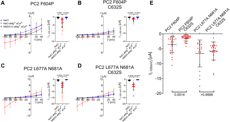 Figure 5. Cysteine residue (C632) is not essential for ion channel function of PC2. (A-D) Left panels: Average I/V-plots (mean ± SD) were obtained from oocytes expressing PC2 F604P or PC2 L677A N681A without (A, C) or with cysteine to serine substitution (C632S) (B, D) using a similar experimental protocol as described is Fig.2. Right panels: Summary data show maximal inward currents reached during application of hyperpolarizing pulses of −100 mV in different bath solutions as indicated. Measurements from individual oocytes and mean ± SD are shown (A, B: N=2, 25≤n≤27; C, D: N=2, n=21; N indicates the number of different batches of Xenopus laevis oocytes, and n indicates the number of individual oocytes analysed per experimental group; the p-values were calculated by Friedman test with Dunn’s post hoc test). (E) Summary data of the same experiments as shown in (A-D). The maximal inward currents reached during application of hyperpolarizing pulses of −100 mV in divalent free NaCl (NaCl øMg2+ øCa2+) bath solution are shown. The p-values were calculated by Kruskal-Wallis test with Dunn’s post hoc test. |