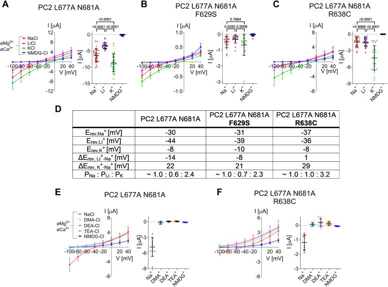 Figure 6. Pore mutation R638C, but not F629S, alters the selectivity of PC2 L677A N681A for monovalent cations.A–C, Selectivity for small inorganic monovalent cations was assessed for PC2 L677A N681A (A), PC2 L677A N681A F629S (B), and PC2 L677A N681A R638C (C) by replacing Na+ in the bath solution by K+, Li+ or NMDG+ in the absence of divalent cations. Left panels: Average I/V-plots (mean ± SD) were obtained using a similar experimental approach as shown in Figure 2. To correct for endogenous oocyte currents (in particular K+ currents), the average whole-cell current values measured in control oocytes (Fig. S4A) were subtracted from the corresponding individual whole-cell current values measured in oocytes from the same batch expressing PC2 constructs. Right panels: Summary data show the maximal inward currents reached during application of hyperpolarizing pulses of −100 mV in the presence of different cations in the bath as indicated. Measurements from individual oocytes and mean ± SD are shown (N = 3, 19 ≤ n ≤ 27; N indicates the number of different batches of Xenopus laevis oocytes, and n indicates the number of individual oocytes analyzed per experimental group; the p-values were calculated by repeated measures one-way ANOVA with Bonferroni post hoc test (A, C) or Friedman test with Dunn’s post hoc test (B)). D, reversal potentials (in mV) observed in the presence of Na+ (Erev,Na+), Li+ (Erev,Li+) or K+ (Erev,K+) were estimated from the averaged I/V-curves shown in (A–C). Reversal potential shifts were calculated by subtracting Erev,Na+ from Erev,Li+ (ΔErev, Li+-Na+) or from Erev,K+ (ΔErev, K+-Na+) and were used to estimate permeability ratios (PNa: PLi: PK; Equation 1). E and F, in additional experiments permeability for mid-size organic monovalent cations was assessed for PC2 L677A N681A (E) and PC2 L677A N681A R638C (F) by replacing Na+ in the bath solution by DMA+, DEA+, or TEA+ in the absence of divalent cations. For correction, the values shown in Fig. S4B were used. Mean ± SD and individual data points are shown (N = 1, n = 10). |