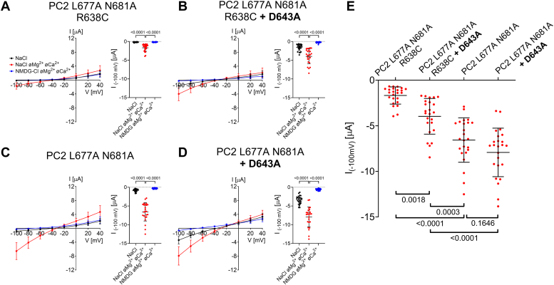 Figure 9. Mutation of a selectivity filter residue (D643A) partially rescues the Na+conductance of PC2 L677A N681A with R638C pore mutation and reduces channel inhibition by divalent cations (Ca2+, Mg2+).A–D, left panels: Average I/V-plots (mean ± SD) were obtained from oocytes expressing PC2 L677A N681A with R638C pore mutation (A), with a combination of R638C and D643A mutations (B), without additional mutations (C), or with D643A mutation (D) using a similar experimental protocol as described in Figure 2. Right panels: The summary data show the maximal inward currents reached during the application of hyperpolarizing pulses of −100 mV in different bath solutions as indicated. Measurements from individual oocytes and mean ± SD are shown (N = 2, n = 24; N indicates the number of different batches of Xenopus laevis oocytes, and n indicates the number of individual oocytes analyzed per experimental group; the p-values were calculated by repeated measures one-way ANOVA with Bonferroni post hoc test). E, summary data of the same experiments as shown in A–D. The maximal inward currents reached during the application of hyperpolarizing pulses of −100 mV in divalent free NaCl (NaCl øMg2+ øCa2+) bath solution are shown. The p values were calculated by one-way ANOVA with the Bonferroni post hoc test. |