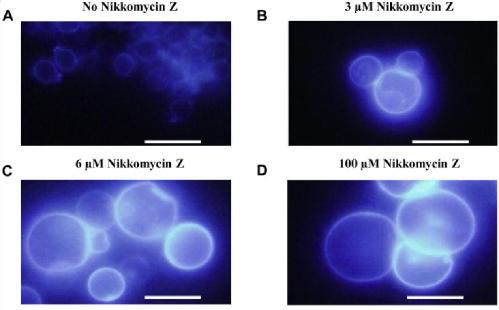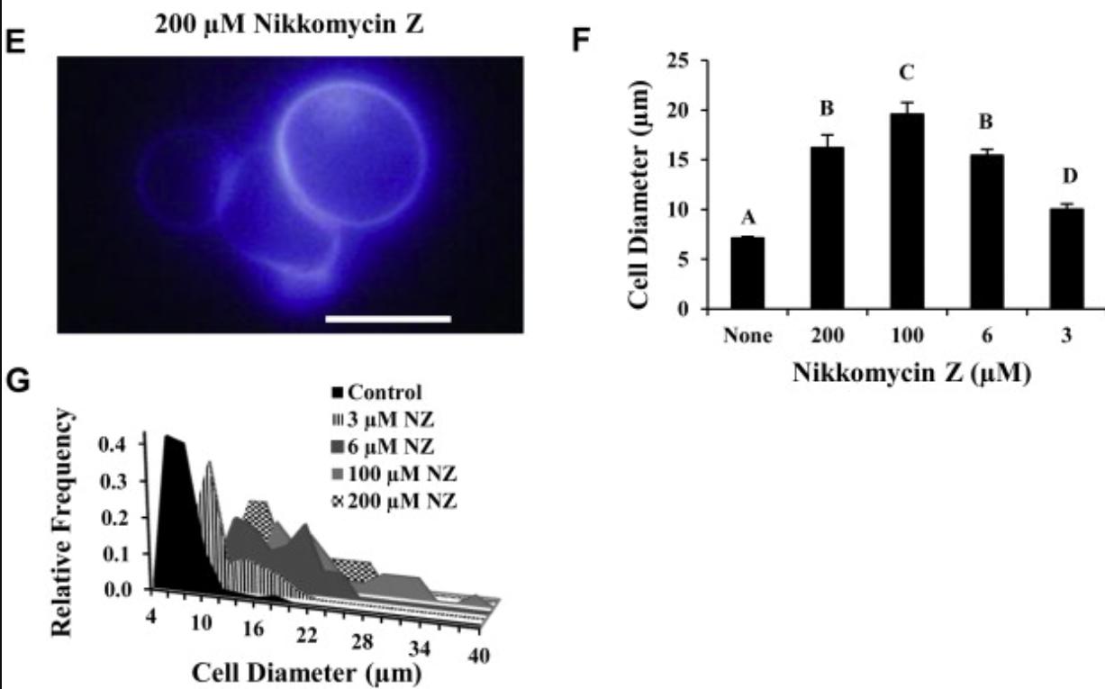 Fig 2. Suboptimal nikkomycin Z (NZ) concentrations altered B. dendrobatidis cellular diameter. Populations treated with or without nikkomycin Z were stained with calcofluor white to visualize the cell walls; these populations included cells that had matured to germlings, thalli, and zoosporangia. (A) When B. dendrobatidis was cultured without nikkomycin Z, zoospore maturation into zoosporangia was unimpeded. Typical mature zoosporangia are shown here with a maximum diameter of approximately 15 μm. (B–E) Increasing concentrations of nikkomycin Z resulted in increasing cell diameters in the zoosporangia at all concentrations tested. (F) The largest cell diameters were observed with zoosporangia that developed in culture with 100 μM nikkomycin Z. Letters within the panel indicate groups that differ significantly by one-way ANOVA. (G) Increasing nikkomycin Z concentrations resulted in larger ranges of observed diameters and more heterogeneous cell populations. Scale bars (A–E) represent 20 μm. |