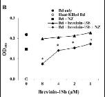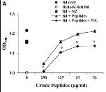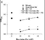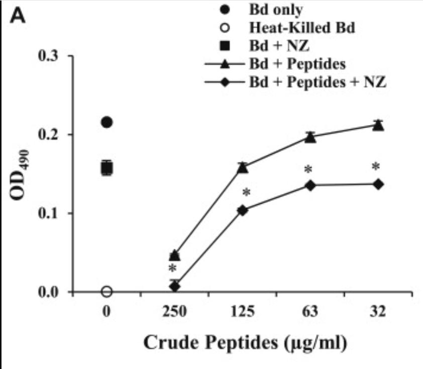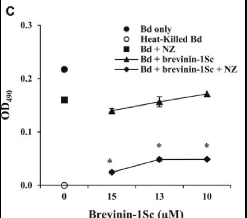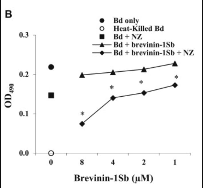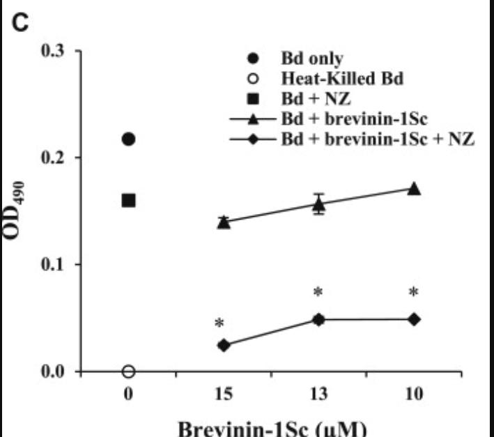 Fig 5. Nikkomycin Z and amphibian AMPs inhibit B. dendrobatidis (Bd) growth in a cooperative manner. (A) B. dendrobatidis cells were cultured in equal parts tryptone broth and HPLC water either alone (‘Bd only’), with serial dilutions of R. sphenocephala AMPs in HPLC water (‘Bd + Peptides’), with 2 μM nikkomycin Z in HPLC water (‘Bd + NZ’), or with both serial dilutions of R. sphenocephala AMPs and 2 μM nikkomycin Z (‘Bd + Peptides + NZ’). A negative control of dead B. dendrobatidis cells (‘Heat-Killed Bd’) was also included in each assay. B. dendrobatidis growth in the presence of NZ and peptides was significantly reduced compared to the growth in the presence of either NZ or peptides alone (*p < 0.05). Similar assays replaced a natural mixture of R. sphenocephala peptides with (B) purified brevinin-1Sb or (C) purified brevinin-1Sc. Each panel is representative of at least three experiments. |