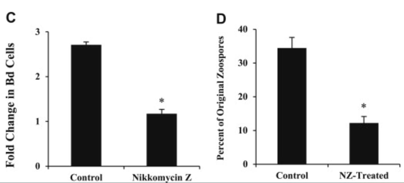 Fig 1. Coculture with nikkomycin Z impaired B. dendrobatidis (Bd) growth in vitro. (A) B. dendrobatidis was cultured in equal parts tryptone broth and HPLC water (‘Bd only’) or in equal parts tryptone broth with various concentrations of nikkomycin Z in HPLC water ranging from 0.02 to 200 μM (‘Bd + Nikkomycin Z’). Concentrations ≥ 0.3 μM nikkomycin Z showed significantly lower growth than the positive control (*p < 0.01). (B) At 2000 μM nikkomycin Z, B. dendrobatidis growth is not significantly different (p > 0.2) from the heat-killed B. dendrobatidis negative control. Data shown are representative of at least three similar experiments. |