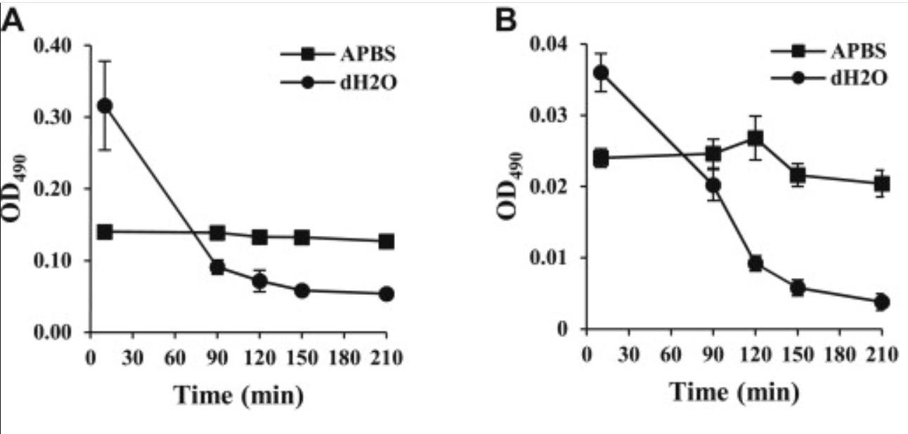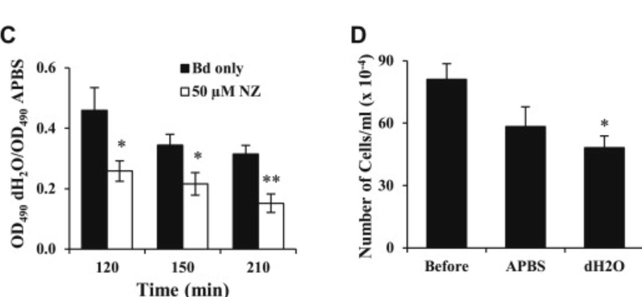 Fig 4. Nikkomycin Z (NZ) exposure increases B. dendrobatidis (Bd) sensitivity to osmotic lysis. B. dendrobatidis alone (A) or with 50 μM NZ (B) are stable in isotonic conditions (APBS), but experienced cellular swelling followed by osmotic lysis in hypotonic conditions (dH2O). Swelling and subsequent lysis are indicated by an initial increase followed by a decrease in OD490 over a 210 min time course. In panels A and B, graphs are representative of three identical experiments for each condition. (C) The ratio of optical densities in dH2O compared to APBS indicates that osmotic lysis is significantly higher in NZ-treated cells (*p < 0.05, **p < 0.001 by unpaired, two-tailed Student's t tests). (D) Cell counts immediately prior to resuspension and 120 min after resuspension in APBS or dH2O indicate that cell numbers significantly decreased in the dH2O hypotonic environment (*p < 0.05 by unpaired, two-tailed Student's t test), but were not significantly changed upon resuspension in isotonic APBS (p > 0.05). Panels C and D show the mean ± SEM of three identical experiments. |