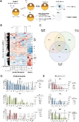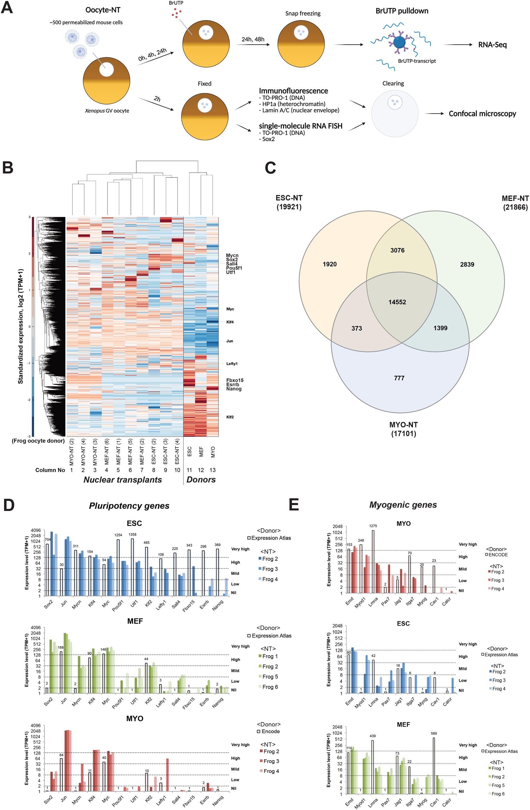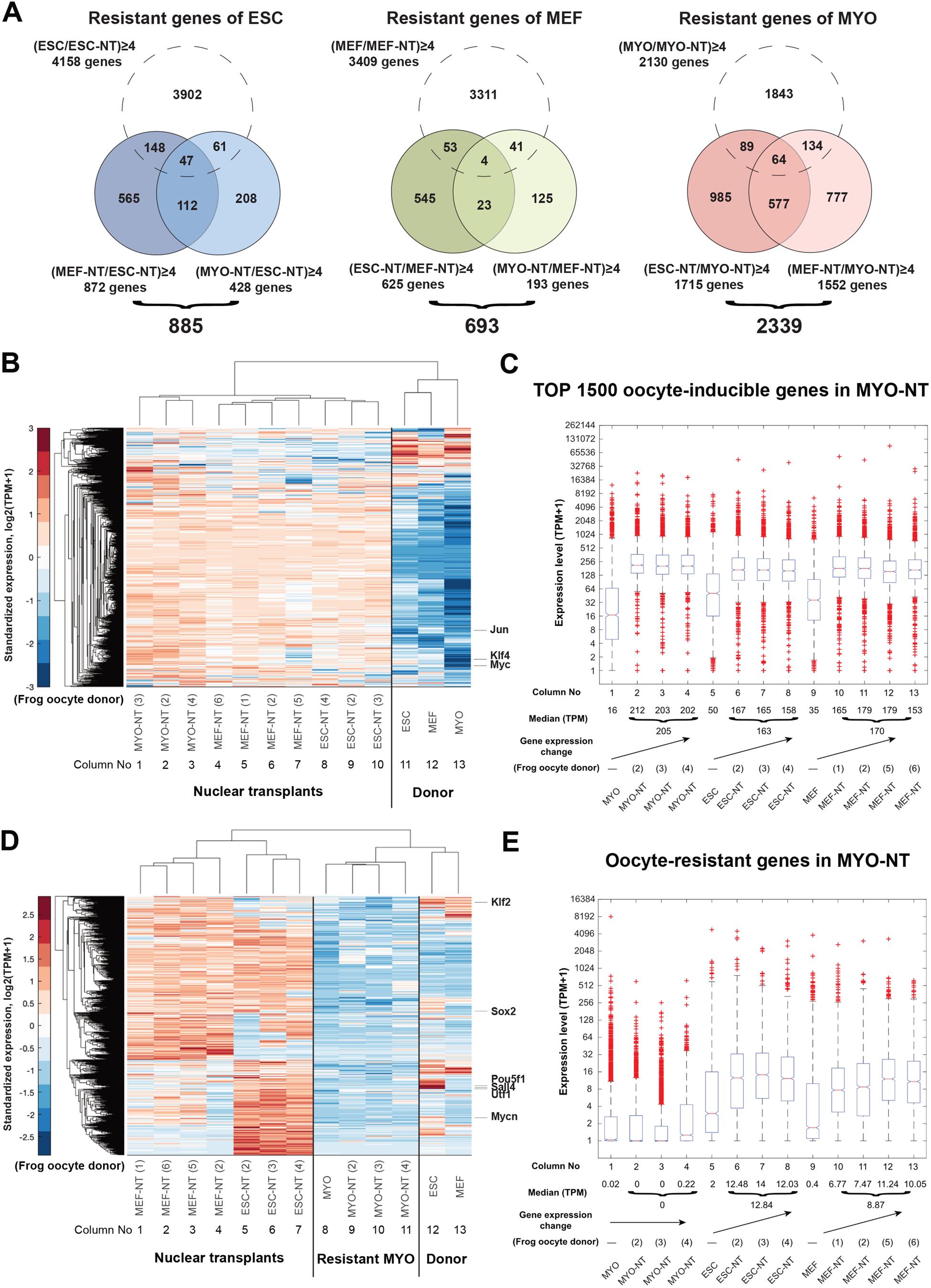 Retention of gene resistance to oocyte reprogramming after the completion of oocyte reprogramming. (A) Venn diagram shows the differentiated MYO nuclei are more resistant to oocyte reprogramming than embryonic ESC and MEF. Among oocyte-inducible genes, the differentially expressed genes (fold change≥ 4) indicates the gene resistance in certain cell types with lower gene expression after nuclear transfer. Considering the transcriptional activity of donor cells may affect the results, genes that are downregulated by oocytes and shown in the oocyte-resistant genes are excluded. (B) Heatmap shows three cell types respond to oocyte reprogramming similarly for the top 1500 highly expressed oocyte-induced genes in MYO-NT. The top 1500 highly expressed genes in MYO-NT includes pluripotency genes, Jun, Klf4 and Myc. (C) Boxplot shows the transcriptional increase in numbers (TPM) for the top 1500 highly expressed oocyte-induced genes in MYO-NT. (D) Heatmap shows the different response among three cell types to oocyte reprogramming for the oocyte-resistant genes in MYO-NT. Oocyte-resistant genes in MYO-NT include six pluripotency genes, Klf2, Sox2, Pou5f1, Sall4, Utf1 and Mycn. (E) Boxplot shows the transcriptional changes in numbers (TPM) for the oocyte-resistant genes in MYO-NT.