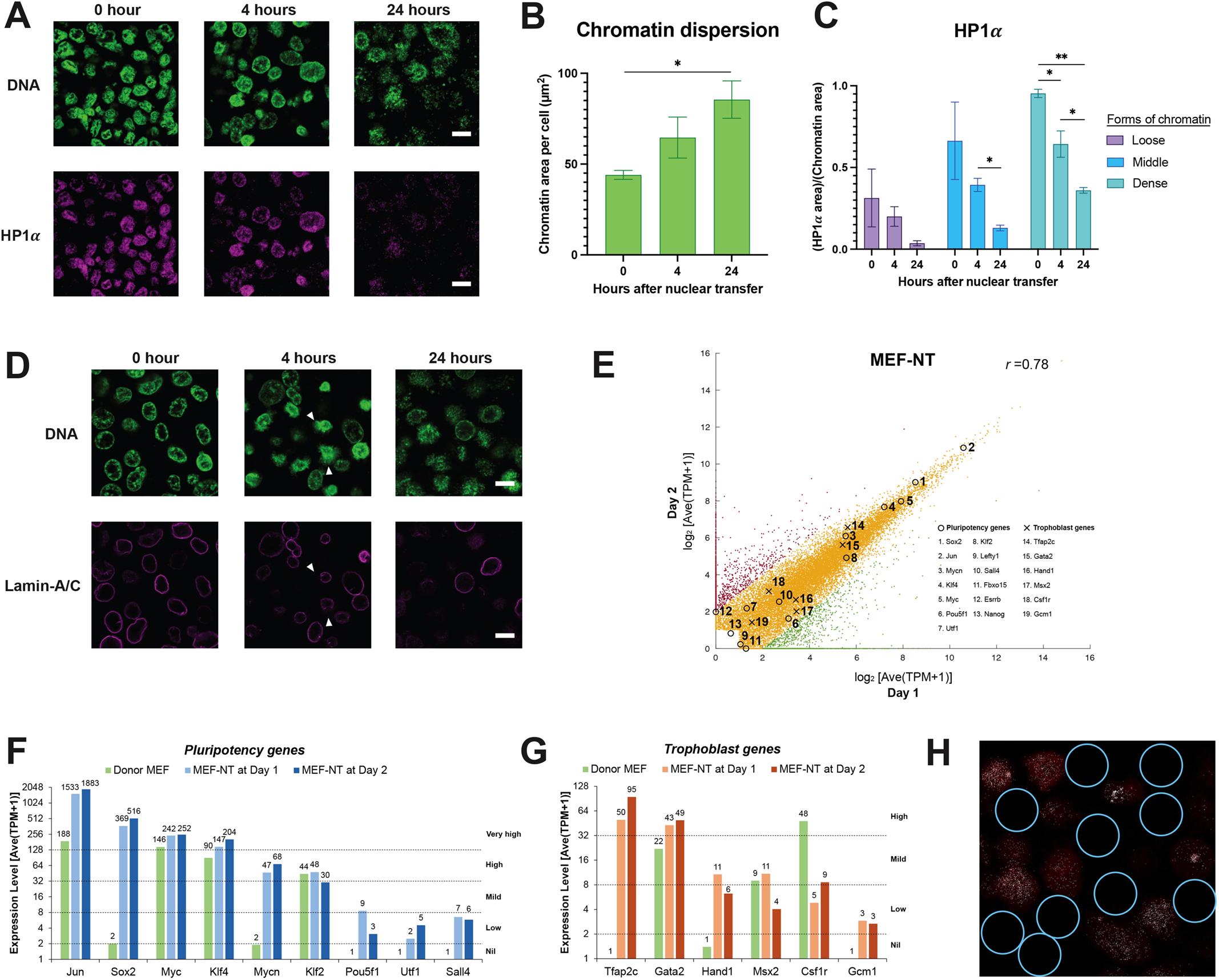 Completion of transcriptional reprogramming to a totipotency-like state by oocytes within 24 h after nuclear transfer. (A) Images show the dispersion of chromatin (in green) and loss of HP1α (in magenta) in MEF after nuclear transfer. Scale bars: 10 µm. (B) Bar chart shows that the chromatin in MEFs dispersed by twofold in area at 24 h after nuclear transfer. Error bars represent±SD. *P<0.05 by the Student's t-test, n=3. (C) Bar chart shows the loss of HP1α in three density levels of chromatin in MEFs from 4 h onwards. At all three time points, the more condensed the chromatin is, the more areas of chromatin occupied by HP1α. Error bars represent±SD. *P<0.05, **P<0.01 by the Student's t-test, n=3. (D) Images show the breakdown of nuclear envelope (in magenta) and burst of chromatin (in green) in nuclei of injected MEF after nuclear transfer. The breakdown of nuclear envelope where chromatin burst was observed (white arrowhead) at 4 h after nuclear transfer. Scale bars: 10 µm. (E) Dot plot shows the high correlation (r=0.78) of transcriptomes between day 1 and day 2 after MEF nuclei transplanted into Xenopus meiotic oocytes. (F,G) Pluripotency genes (F) and trophoblast genes (G) in transplanted MEFs were activated by oocyte factors on day 1 after nuclear transfer and remain at the same expression level on day 2. (H) Sox2 transcripts (white spots) were activated by oocyte factors in all transplanted MEFs at 24 h after nuclear transfer. The red color shows TO-PRO-1 stain for chromatin of MEFs. The areas outlined in blue show the absence of hybridized probes to the background areas between MEF nuclei.