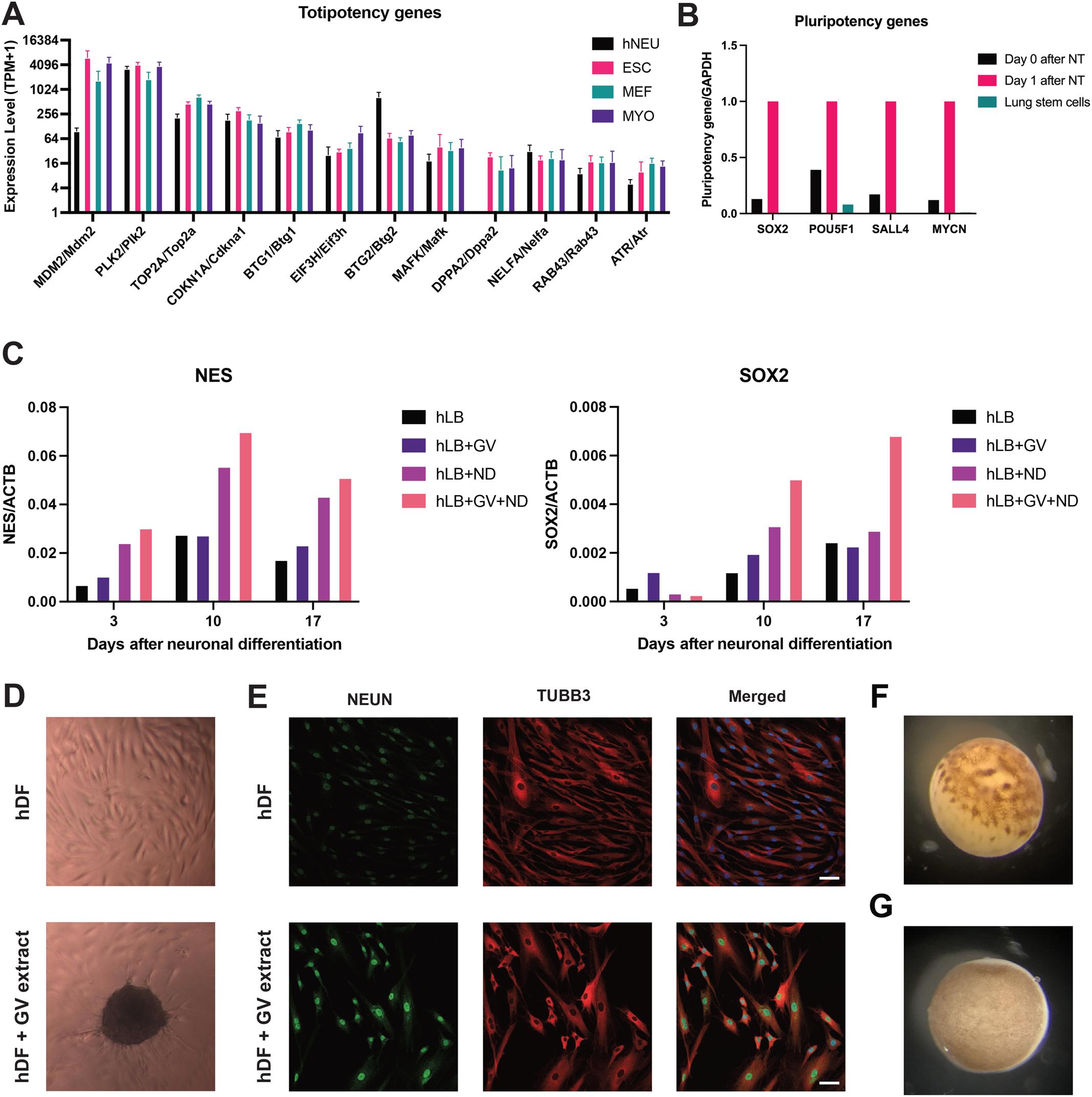 Translational approach from nuclear transfer to in vitro culture. (A) Bar chart shows the induction of totipotency genes in mouse cells (ESC, MEF, and MYO) and human cells (hNEU) on day 2 after nuclear transfer. ESC, n=3; MEF, n=4; MYO, n=3; hNEU, n=3. (B) Bar chart shows the activation of pluripotency genes in human lung stem cells after nuclear transfer. (C) Bar chart shows the increase in gene expression of the neural progenitor markers from reprogrammed hLB by GV extracts after neuronal differentiation. GV, treatment of GV extracts; ND, treatment of neuronal differentiation medium. (D) hDF formed and maintained as embryoid bodies on day 15 after GV extract treatment. The dark area in the lower figure is an embryoid body. (E) GV-extract treated hDF shows the expression of neuronal differentiation markers on day 21 after neuronal differentiation. NEUN (in green) and TUBB3 (in red) are markers for neuronal differentiation. The nuclei are stained by DAPI (in blue). Scale bar: 50 µm. (F) Image shows the unfertilized egg (metaphase II) 8 h after injecting adult human lung stem cell nuclei. (G) Image shows the oocyte in meiotic prophase I 3 days after the injection of adult human lung stem cell nuclei.