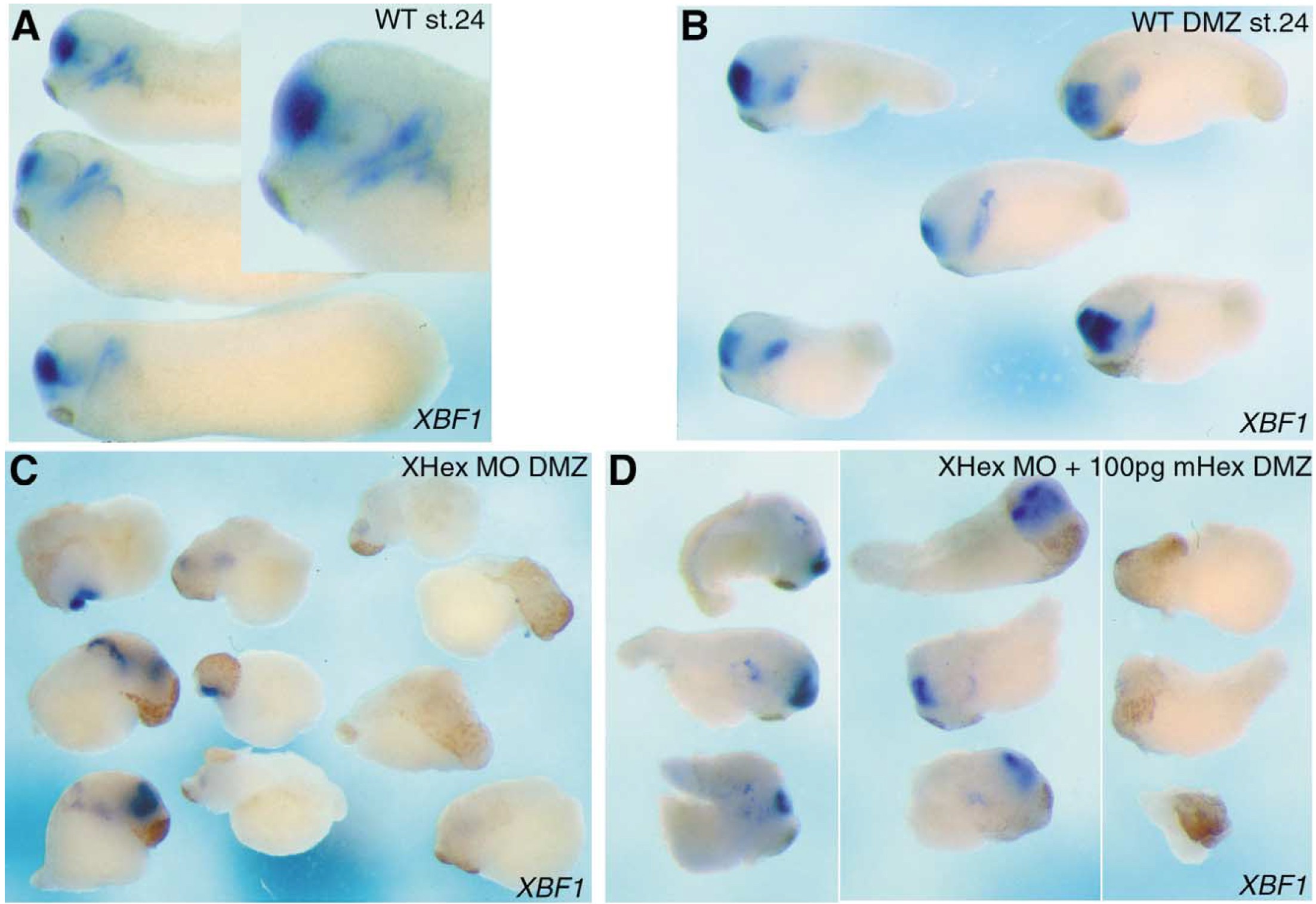 morphology. DMZs coinjected with the Xhex MO (40 ng) and mouse Hex RNA (D, 100 pg) appear more wild-type in morphology and a normal XBF1