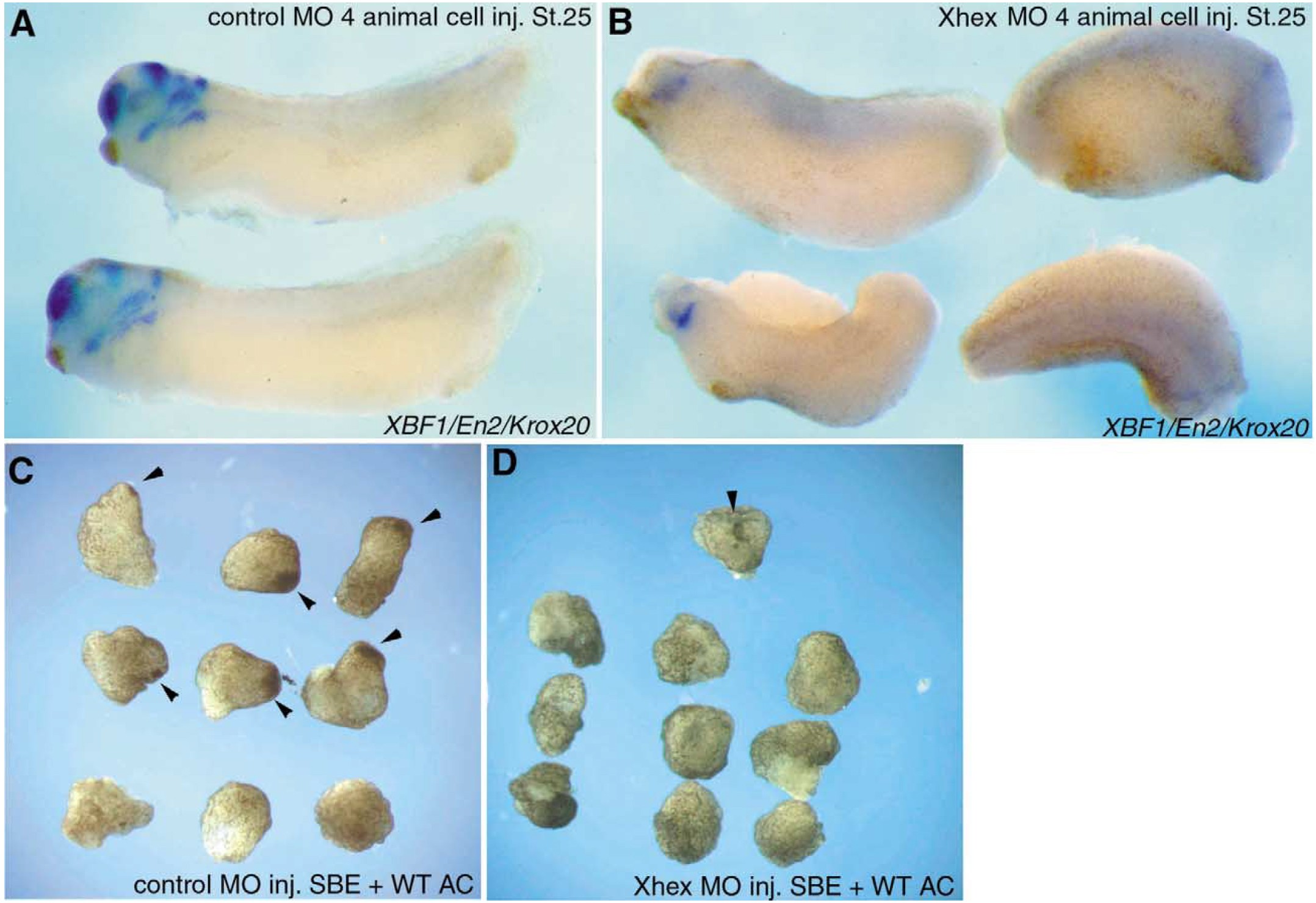 embryos). Control siblings (D) show wild-type XBF1/En2/Krox20 expression while Xhex MO-injected embryos (C) exhibit reduced or no expression of these