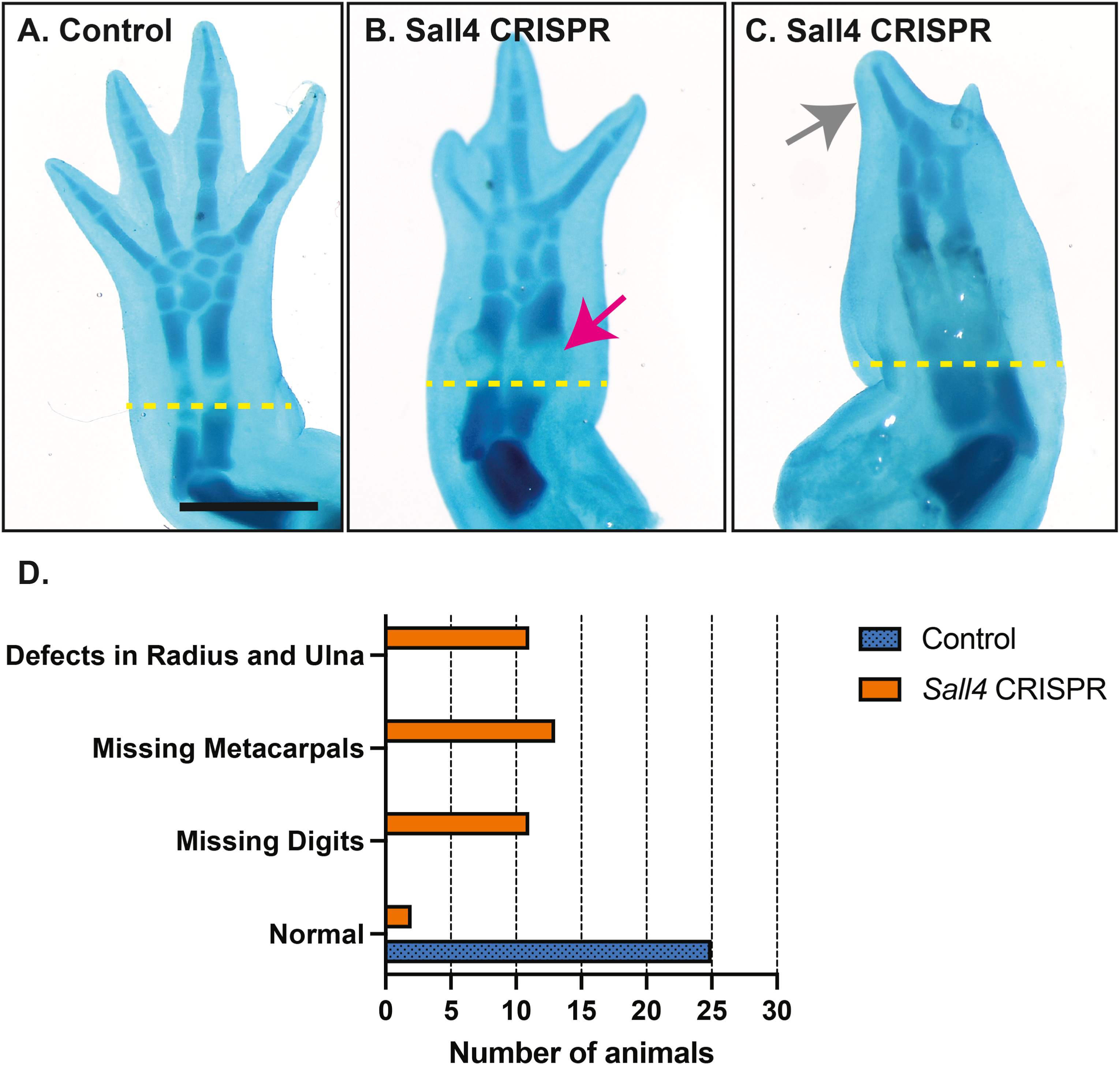Many salamanders can completely regenerate a fully functional limb. Limb regeneration is a carefully coordinated process involving several defined stages. One key event during the regeneration process is the patterning of the blastema to inform cells of what they must differentiate into. Although it is known that many genes involved in the initial development of the limb are re-used during regeneration, the exact molecular circuitry involved in this process is not fully understood. Several large-scale transcriptional profiling studies of axolotl limb regeneration have identified many transcription factors that are up-regulated after limb amputation. Sall4 is a transcription factor that has been identified to play essential roles in maintaining cells in an undifferentiated state during development and also plays a unique role in limb development. Inactivation of Sall4 during limb bud development results in defects in anterior-posterior patterning of the limb. Sall4 has been found to be up-regulated during limb regeneration in both Xenopus and salamanders, but to date it function has been untested. We confirmed that Sall4 is up-regulated during limb regeneration in the axolotl using qRT-PCR and identified that it is present in the skin cells and also in cells within the blastema. Using CRISPR technology we microinjected gRNAs specific for Sall4 complexed with cas9 protein into the blastema to specifically knockout Sall4 in blastema cells only. This resulted in limb regenerate defects, including missing digits, fusion of digit elements, and defects in the radius and ulna. This suggests that during regeneration Sall4 may play a similar role in regulating the specification of anterior-proximal skeletal elements.