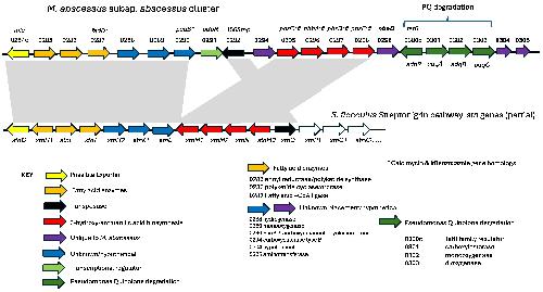 Figure 1. Putative secondary metabolite pathway in M. abscessus. The cluster of genes (MAB_0284c to MAB_0305) is shown at the top, with the MAB ORF number designations from the genome of M. abscessus ATTC 19977. Embedded within the cluster are MAB_0330c to MAB_0303, also known as the adqRABC cluster, which has been shown to be responsible for the degradation of quinolone signaling molecules from P. aeruginosa [31]. The MAB_0284c to MAB_0290 genes are syntenic with those in the streptonigrin pathway genes (stnG to stnL), as shown below the Mab cluster. MAB_0290 and MAB_0295 to MAB_0298 are also syntenic with the streptonigrin genes, except that they are inverted in Mab and include two additional genes, a transcriptional regulator (MAB_0291, cdaR) and a putative carboxyesterase (MAB_0294). Mab gene products that are homologous to those in the calcimycin and benzoxazole pathways are indicated (* or #). Genes unique to the Mab cluster are shown in bold: MAB_0291 (cdaR), MAB_0294 (putative carboxyesterase), MAB_0299 (nbaD, a putative aminohydrolase), MAB_0304 (hypothetical), and MAB_0305 (putative aminotransferase). Predicted functions of some of the gene products are color-coded in the key.