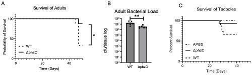Figure 2. Survival of adult frogs and tadpoles following ip inoculation with either WT Mab or ∆phzC Mab. (A) One-year-old frogs (six per group) were (ip) inoculated with 5 × 105 CFU of WT or ∆phzC Mab and monitored for 50 days for survival. (B) The bacterial loads in livers of adult frogs from A, determined at the end of the experiment. (C) Two-week-old tadpoles (st. 44–45, 10 per group), were inoculated with 5 × 105 CFU of WT or ∆phzC Mab. As a negative control, tadpoles were injected with APBS. Survival was monitored for 50 days for survival. Statistical differences between groups were assessed by a log-rank (Mantel–Cox) test (* p > 0.05; ** p > 0.001).