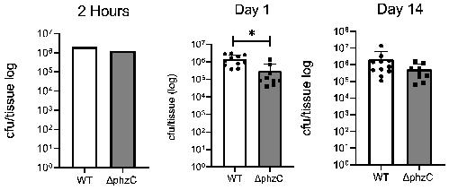 Figure 3. Changes in bacterial loads in tadpoles following (ip) inoculation with WT or ∆phzC Mab. Three-weeks-old tadpoles (stage 55; 10 per group) were (ip) inoculated with 5 × 105 CFU of either WT or ∆phzC Mab. Colony assays was performed on liver lysates at 1 and 14 days post-infection. One tadpole per condition was also tested 2 h post-infection to control the initial infection load. Statistical differences between the groups was determined by t-test (* p > 0.05).