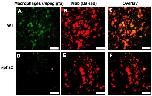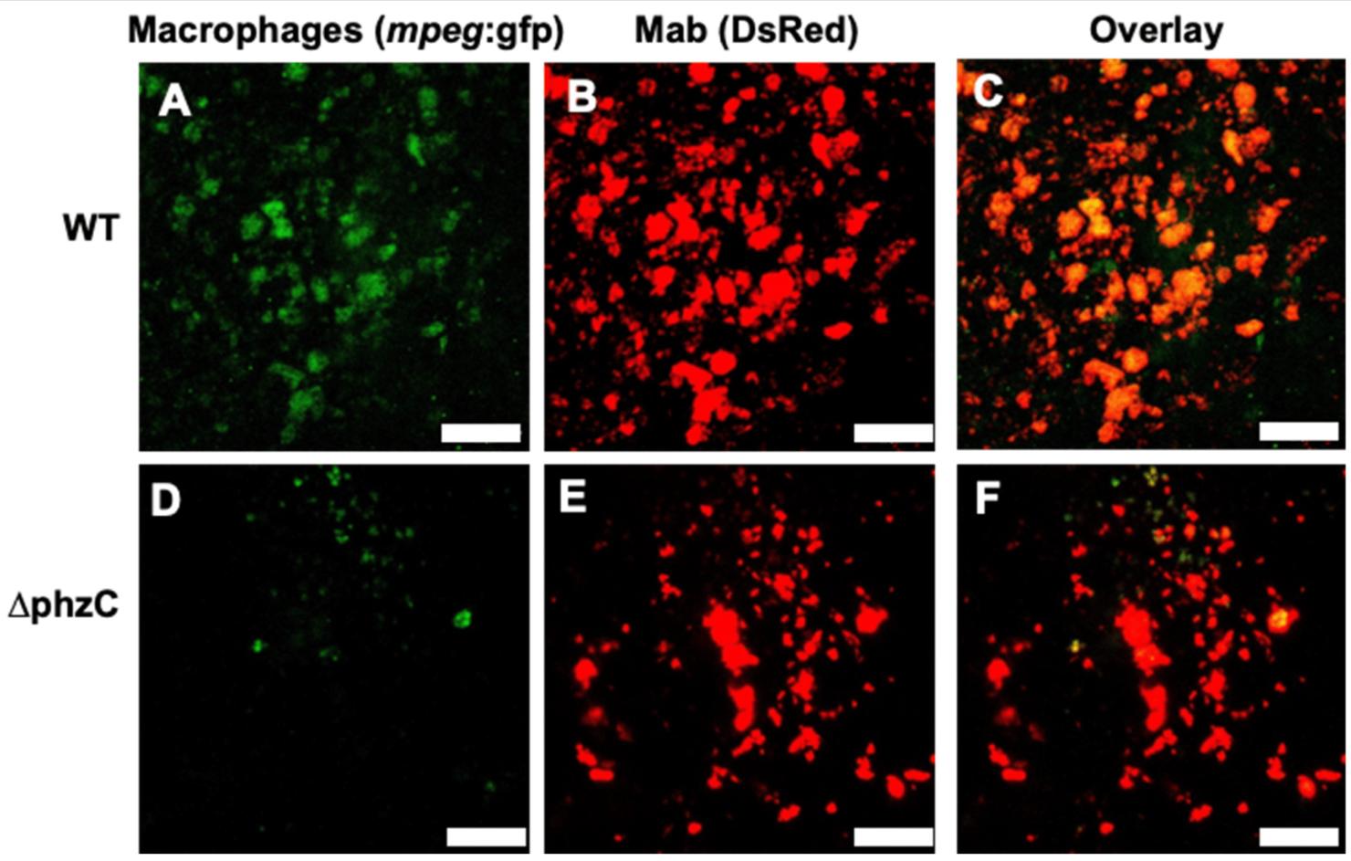 Figure 5. Visualization by intravital confocal microscopy of macrophage recruitment and infection in representative tadpoles 1 day after tail wound inoculation. DsRed WT (A–C) or ∆phzC Mab (D–F) were inoculated using a biopsy punch in the tailmuscle of mpeg:GFP transgenic tadpoles (stage 56). Infiltration of mpeg1+ macrophage (green) and mycobacteria-infected macrophages (red+ green+) were monitored in live tadpoles at 1 dpi using confocal microscopy (Leica DMi8 Inverted Microscope). GFP only (A,D), DsRed only (B,E), and overlayed (C,F) signals are shown. Size bar: 10 μm.