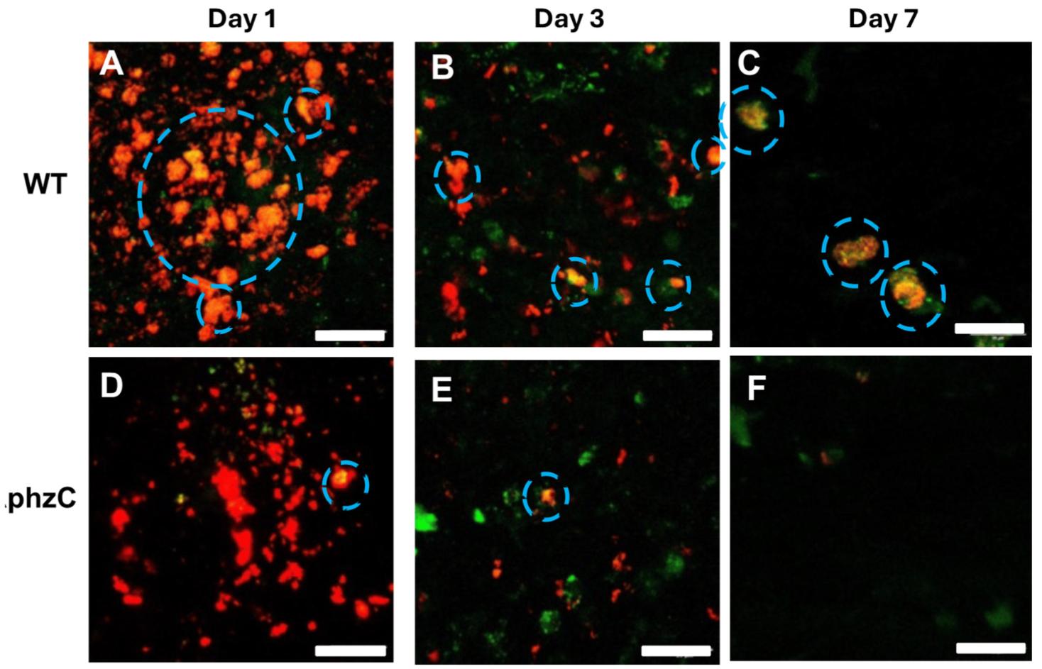 Figure 6. Visualization of macrophage recruitment and infection following 1, 3, and 7 days following tadpoletail wound inoculation using intravital confocal microscopy. DsRed WT (A–C) or ∆phzC (D–F) Mab were inoculated with a biopsy punch in the tailmuscle of mpeg:GFP transgenic tadpoles (stage 56). GFP mpeg1+ macrophage (green) and DsRed mycobacteria-infected macrophages (red+ green+) were monitored in live tadpoles at 1, 3, and 7 dpi by confocal microscopy (Leica DMi8 Inverted Microscope). Overlayed (red+/green+) signal is shown. Infected macrophages are circled. Size bar: 10 μm.
