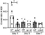 Figure 7. Volume ratio of DsRed Mab determined by confocal microscopy using the Imaris microscopy image analysis software to calculate the total volume of DsRed bacteria versus the total volume of GFP-expressing macrophages. The volume ratio was calculated for each tadpoletail wound from sections that totaled between ~1–2 square millimeters. N = 5 per group. (*) p > 0.05.