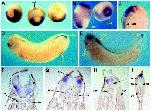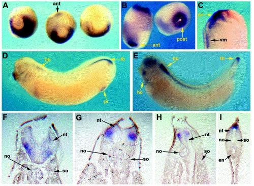 Fig. 3. Whole mount in situ hybridization analysis of xlr expression in Xenopus embryos. (A) Mid-gastrulae (stage 11.5) viewed from the vegetal pole (AP), dorsal surface uppermost. Transcripts are localized to the lateral and ventral marginal zone and a dorsal-anterior (ant) patch. (B) Neurula stage embryo (stage 18) showing strong expression of xlr around the blastopore (post) and an anterior-ventral (ant) patch close to the cement gland. Weaker expression is also detected throughout the ventral half of the embryo. (C) Sagital section through neurula stage embryo (stage 18) showing that the strong anterior-ventral expression of xlr is localized to the pharyngeal endoderm (pe), while the weaker ventral expression is localized to the ventralmesoderm (vm). (D) Early tailbud stage embryo (stage 26) showing strong expression of xlr in the tailbud (tb) and posterior neural plate. Expression is also detected in the proctodeum (pr) and hindbrain (hb). (E) Tailbud stage embryo (stage 32) showing strong expression of xlr in the tailbud (tb) and hindbrain (hb). Note that hindbrain expression spreads into anterior portions of the spinal cord. Weaker expression can also be seen in the head, heart (he), and pronephric duct (pnd). (FâI) Transverse histological sections through a stage 32 embryo, similar to that shown in (E), showing xlr expression in the neural tube (nt). no, notochord; so, somite; en, endoderm. (F) Section through the anteriorhindbrain. (G) Section through the posteriorhindbrain/anterior spinal cord. (H) Section through the posterior spinal cord. (I) Section through the posteriortail.