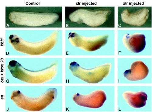 Fig. 5. Anterior defects in Xenopus embryos injected with 1.5Â ng of xlr mRNA. (A) Uninjected tailbud stage embryos. (B) Weakly affected xlr injected embryo, note reduction in size of anterior structures. (C) Strongly affected xlr injected embryo, (D) Uninjected embryo showing xbf1 expression in the telencephalon and neural crest migrating into the branchial arches. (E) Weakly affected xlr injected embryo showing reduced xbf1 expression, indicating a reduced telencephalon. (F) Strongly affected xlr injected embryo with little xbf1 expression, indicating a dramatic reduction in the size of the telencephalon. (G) Uninjected embryo showing otxA expression in the forebrain and retina, and krox20 expression in rhombomeres 3 and 5 of the hindbrain. (H) Weakly affected xlr injected embryo showing reduced expression of otxA, indicating a reduction in the size of the forebrain and retina. Although two stripes of krox20 expression are evident, the gap between them is less distinct. (I) Strongly affected xlr injected embryo with greatly reduced otxA expression and a single krox20 stripe, indicating a dramatic reduction in the size of the forebrain, midbrain and hindbrain. (J) Uninjected embryo showing engrailed (en) expression at the midbrain-hindbrain boundary. (K) Weakly affected xlr injected embryo showing little affect on en expression. (L) Strongly affected xlr injected embryo with no en expression, indicating an absence of the midbrain and perhaps anterior portions of the hindbrain. The results suggest that injection of xlr mRNA causes severe reductions in anterior neural structures, including the forebrain, midbrain, and parts of the hindbrain.