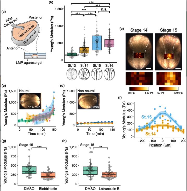 stage15–16 = .66). (c, d) Stiffness of the neural plate (c) and non‐neural ectoderm (d), measured by repeated indentations of the same embryos (n = 4 each). The 0‐ and 150‐min marks correspond approximately to stages 13 and 16, respectively. The insets show representative images of stage 15 embryos during the measurements. Anterior is to the left. The dashed lines indicate the cantilevers at the rest position. (e) Two‐dimensional mapping of neural plate stiffness at stages 14 (left) and 15 (right). Anterior is to the top. Magnified views of the color‐coded stiffness map are shown at the bottom. Scale bars: 250 μm. (f) A plot of stiffness along the mediolateral axis at stages 14 (orange) and 15 (blue), shown in (e). Zero, negative, and positive values correspond to the midline, left, and right sides, respectively. (g, h) Stiffness of the neural plate treated with blebbistatin (g) and latrunculin B (h); n = 24 indentations, 9 embryos (DMSO in g); 30 indentations, 10 embryos (blebbistatin); 31 indentations, 10 embryos (DMSO in h); and 36 indentations, 12 embryos (latrunculin B). Both treatments reduced neural plate stiffness compared with DMSO controls (p