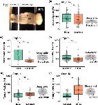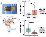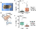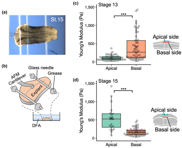 FIGURE 2. Elasticity of neural plate explants. (a, b) A representative image (a) and schematic (b) of atomic force microscopy (AFM) measurement. Anterior is to the left. An excised neural plate explant is fixed on a plastic dish using pieces of thinly pulled glass capillaries and silicon grease. The explant surface (orange) is indented using a bead‐attached AFM cantilever. The dashed line indicates the midline. (c, d) Stiffness of the apical and basal surfaces of the neural plate at stages 13 (c) and 15 (d); n = 49 indentations, 4 embryos (stage 13, apical); 54 indentations, 5 embryos (stage 13, basal); 20 indentations, 7 embryos (stage 15, apical); 55 indentations, 19 embryos (stage 15, basal). The apical surface (green) was softer than the basal surface (orange) at stage 13 (p = 4.2 × 10−6), but stiffer at stage 15 (p = 2.5 × 10−7). The box and whiskers indicate the maximum, third quartile, median, first quartile, and minimum values of each group; data beyond the end of the whiskers (the upper limit of whiskers is 1.5 times the box length) are shown as outliers; a cross mark indicates the mean value. p‐values were calculated using the two‐sided Wilcoxon rank‐sum test (***p < .001). |