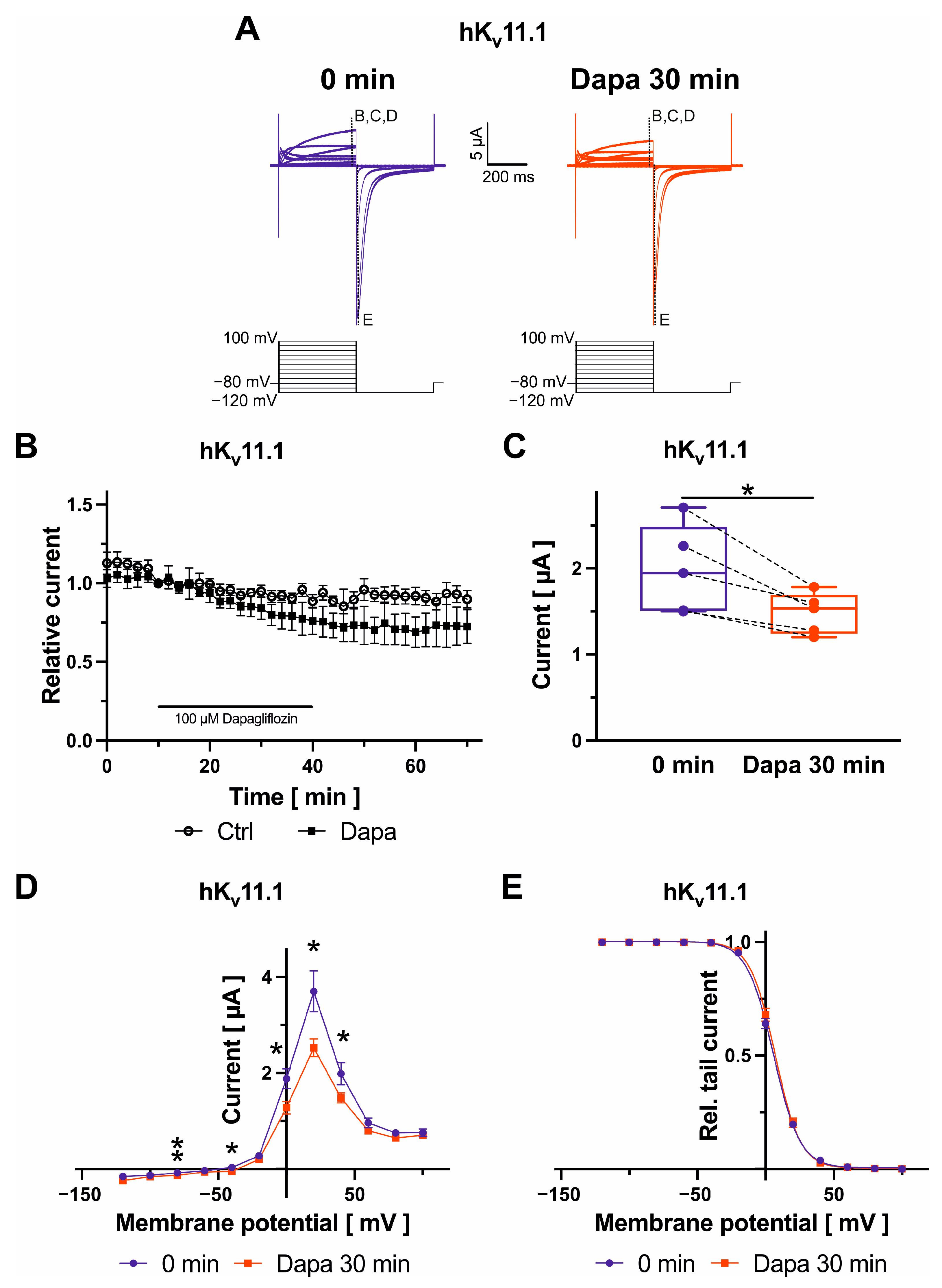 Figure 1. Biophysical effects of dapagliflozin on Kv11.1 channels. Original current traces evoked with indicated voltage protocols with time-point of analyses marked according to the respective panel (A) and maximum current amplitudes at +40 mV are shown before and after administration of 100 µM dapagliflozin ((B) Dapa n = 5, Ctrl n = 11; (C) n = 5) for 30 min. Currents were normalized to the last current measurement under control conditions (panel (B)). Box plots represent median, 25th, and 75th percentiles, as well as minimum and maximum measured value. Dots in panel (C) represent raw data. Current–voltage relationships for currents measured during the first step of the voltage protocol are displayed in panel (D). Panel (E) displays voltage-dependence of activation. To assess voltage-dependence of activation, maximum tail current amplitudes were measured. For each individual oocyte the maximum tail current was set as “1”. Tail currents recorded after test potentials were then normalized to respective maximum tail currents for each cell. No specific normalizing function was applied. Mean values of normalized tail current amplitudes are shown. * p < 0.05, ** p < 0.01 (please note that p values are not indicated in panel (B) for clarity of data presentation).